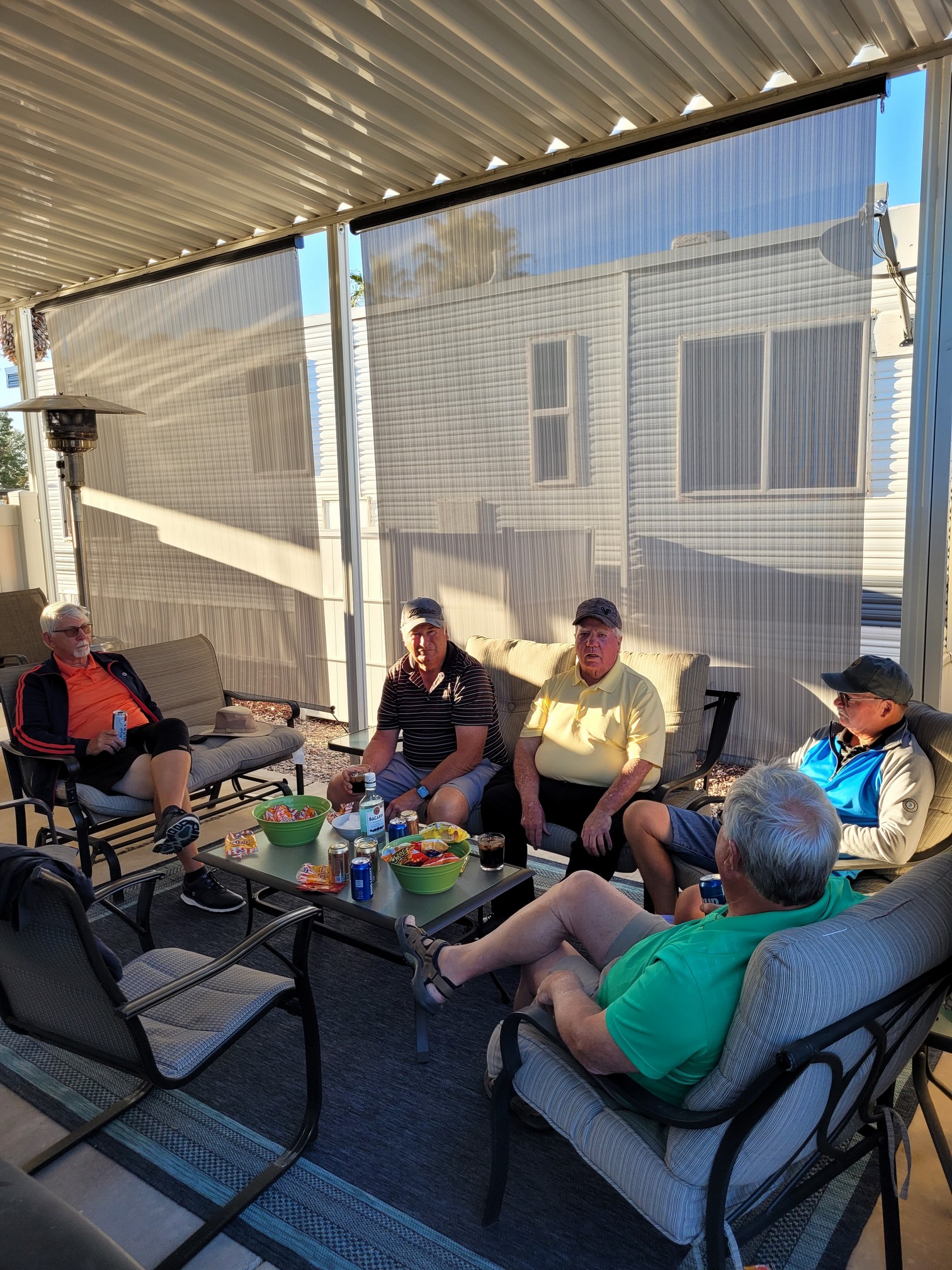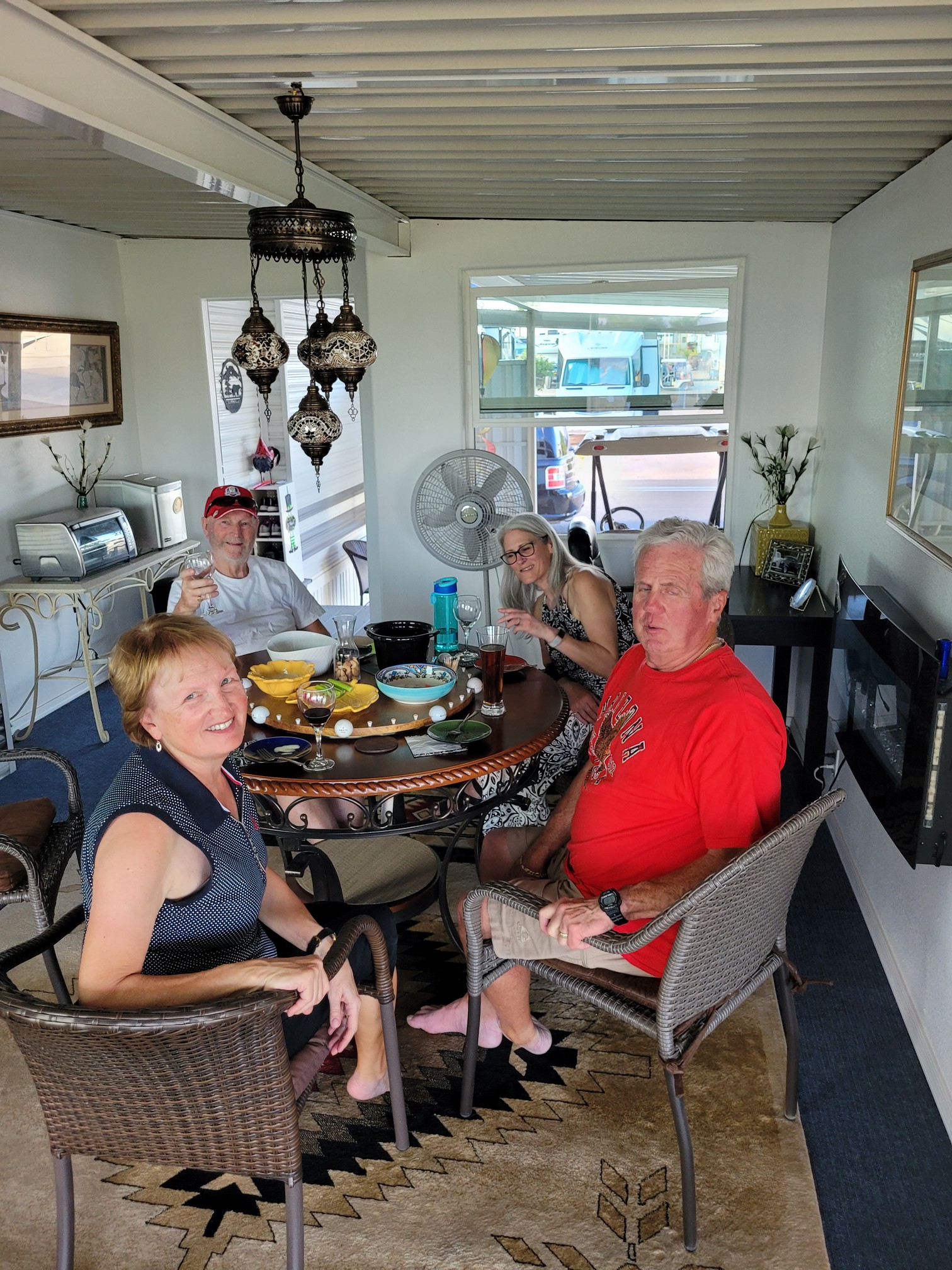Later in the afternoon after Jeff & Wendy had all sunned up at the pool Jackie & I went over to their place. That is one thing we do not do any more. I used to love sun tanning but after Jackie had a mark burned off her nose and i had several spots frozen off the top of my head, we simply to do not see the value of a tan anymore. When we used to go on vacation, we wanted a dark tan to “show off” when we got home. Today we are in the sun every day so no need to bake also.