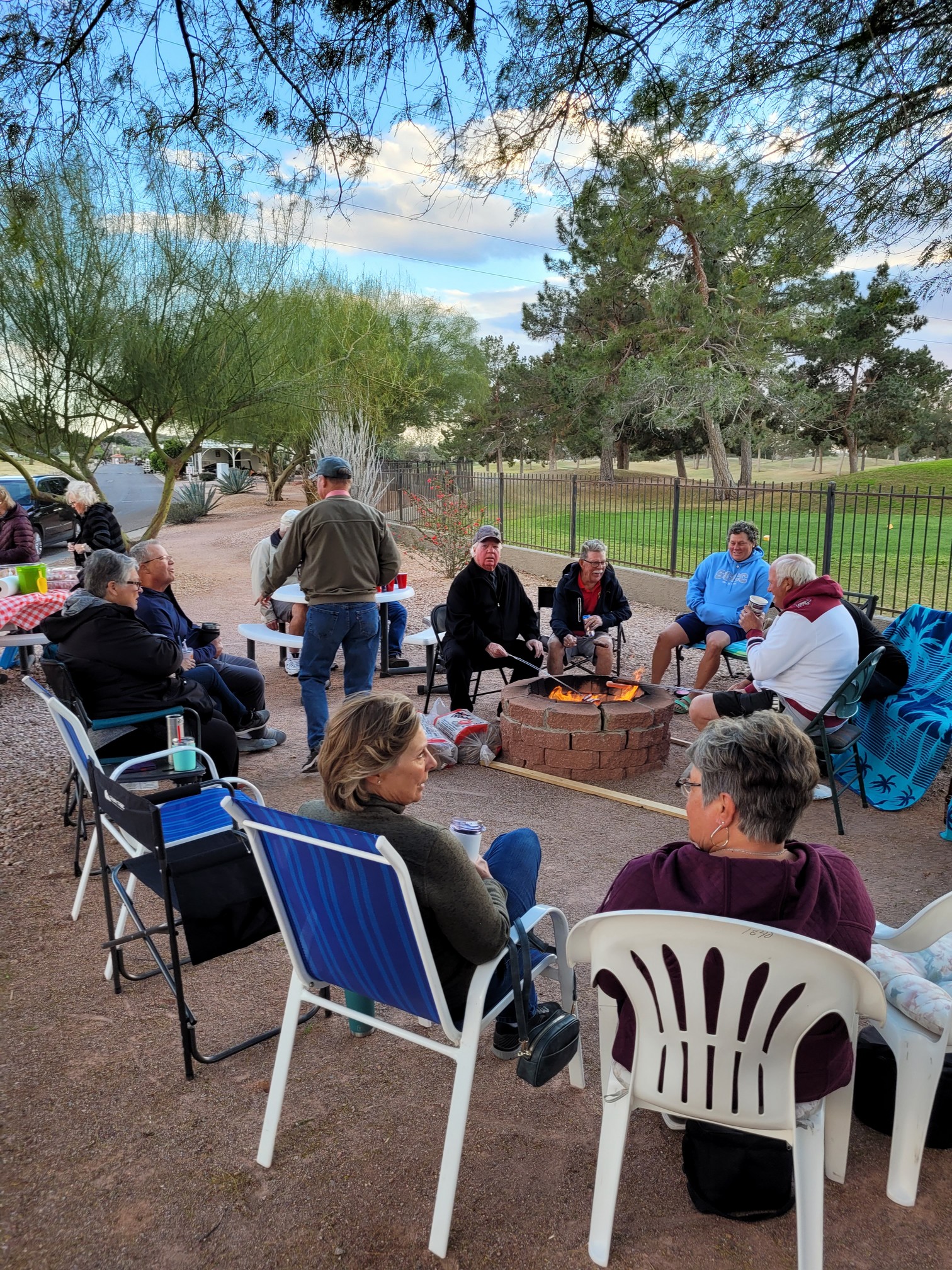 Arriving at the firepit site Wendy had the fire going and reserved the spot and a bit later Jackie arrived with all of the picnic goodies. It was time for our Annual Viewpoint Golfers Weiner Roast as we only have three weeks left before we head home. This year we had 23 guests. This size of group is easily managed and is fun. I know I previously said what we are having but I will reiterate.