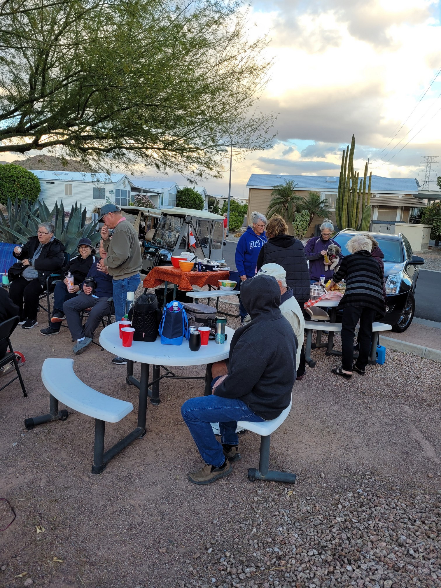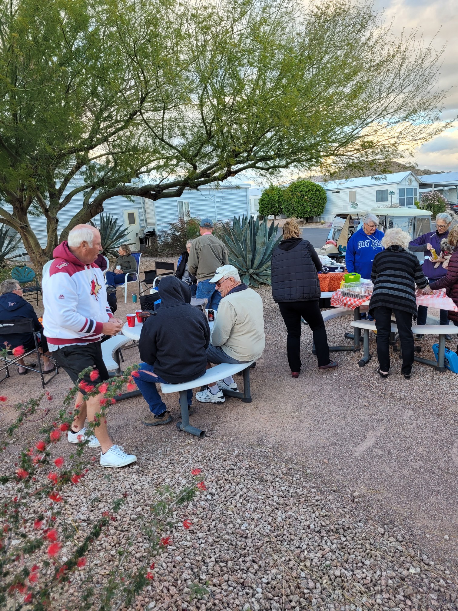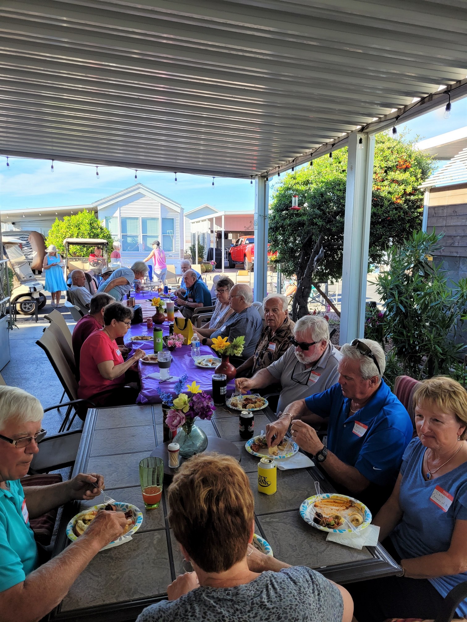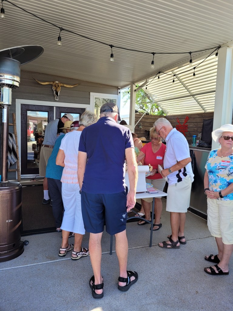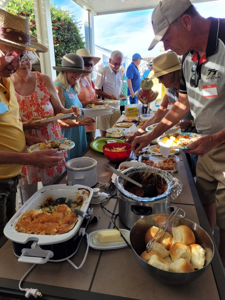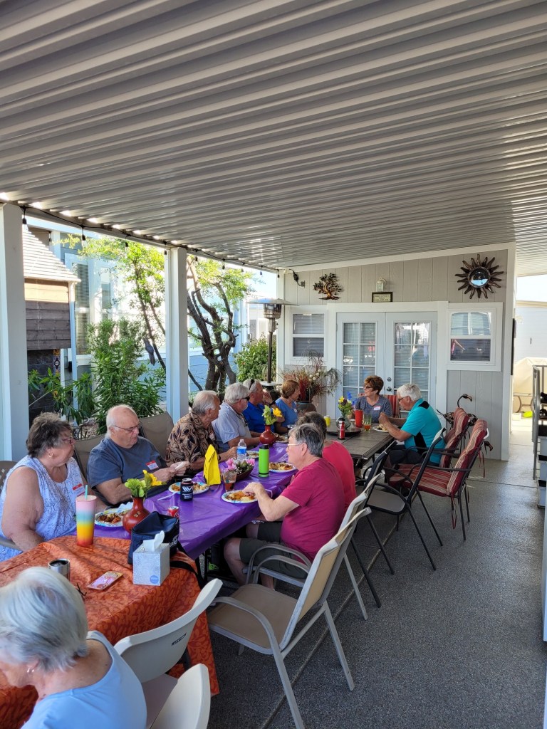 Today was our going away block party held at our place. It was fantastic that Randy & Donna agreed to share our spacing to allow more shade and room for serving and eating. We set up the chairs and tables under their carport and out into the street and we set up all of the food on our tables and outdoor kitchen. We had like 95% of the block show up so we were full. The potluck selection is still being influenced by Covid but luckily between us and a couple of others we had plenty of food. We used up the last of our hamburger meat (2 pounds) by making a Sheperd’s Pie, and we had a great tasting large Chili, some great chicken fingers, balls, Deviled eggs and a multitude of other dishes. My only complaint on potlucks is that there is NEVER enough of them and in fact this time by my turn they were all gone. Darn.