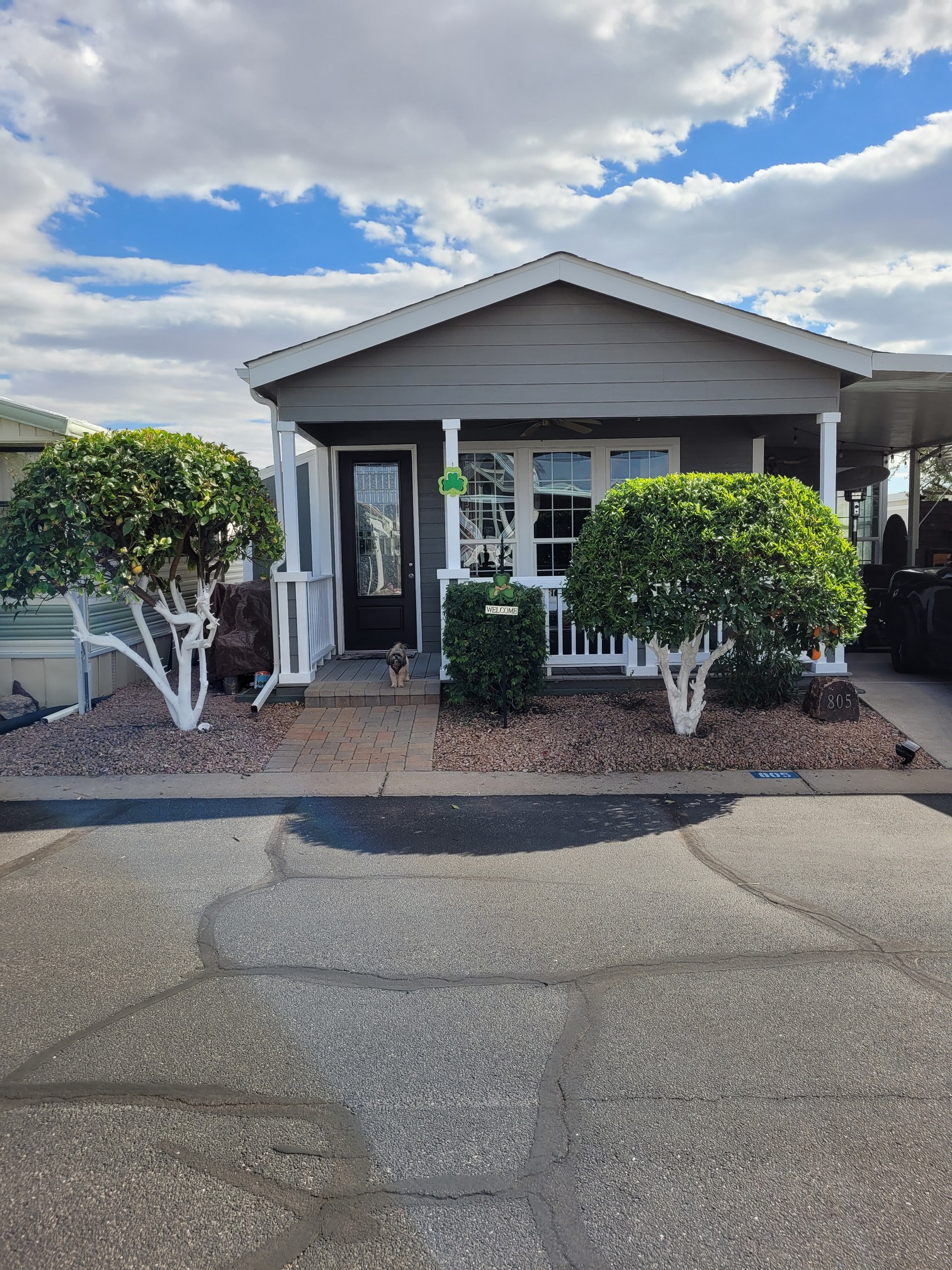 Then off the front to do some pre-leaving tree trimming. I took a lot off and they look wonderful. Mean trees with thorns up to 3 inches long. I now need to “paint” the trunks white which I will get done later this week.
