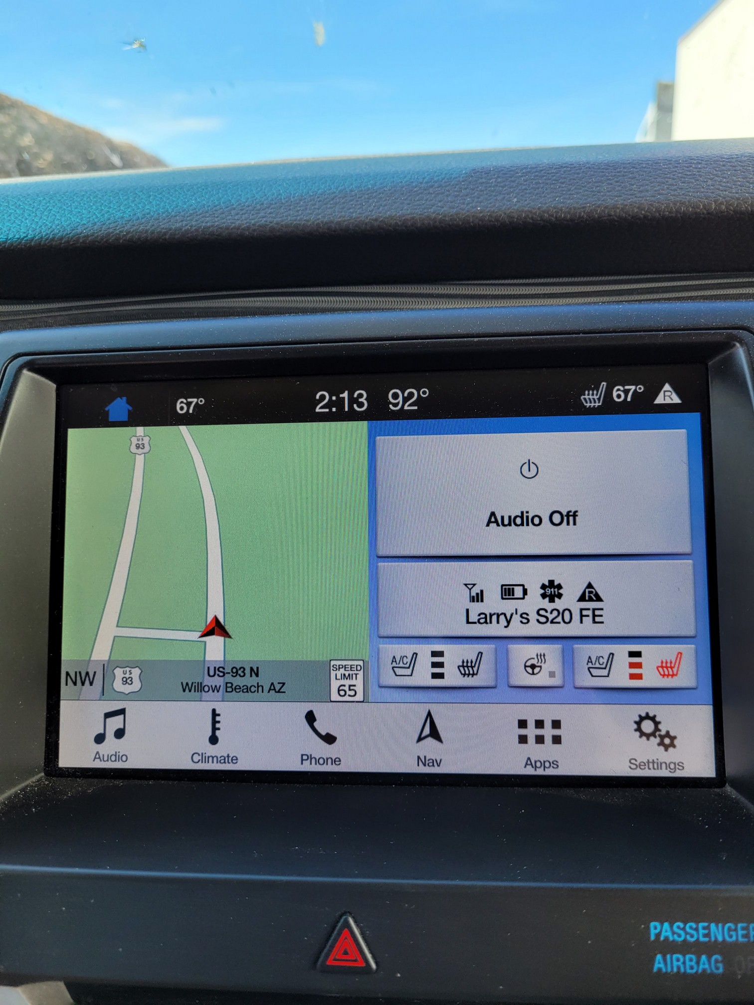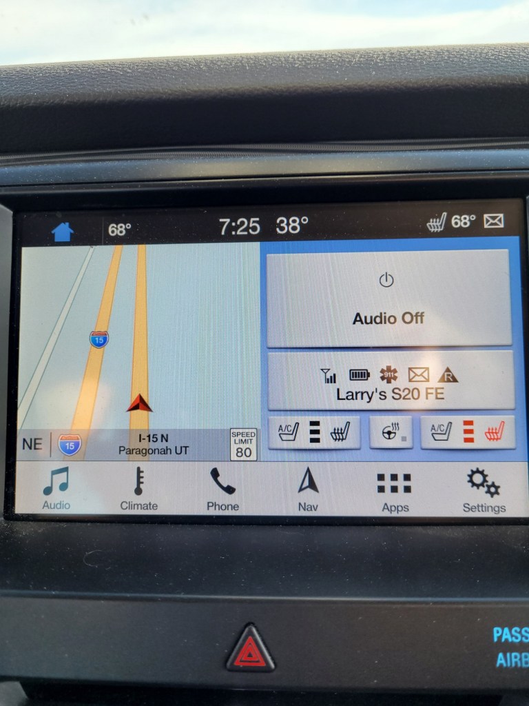 This is the coolest day of the next 3 days. Wonderful. You may also notice the a/c is on and set at 67 degrees plus the passenger side seat warmer is on. To explain Jackie has been having back issues lately and hopes the heat will help with the muscles. Also note audio off. The peace, quiet and enjoyment of driving not wrecked by music. By myself on a open highway music is good as it keeps you awake but it can cause a headache after a long day driving. Depending on the tunes it can make you sleepy or excited and cause extra stress for drivers.