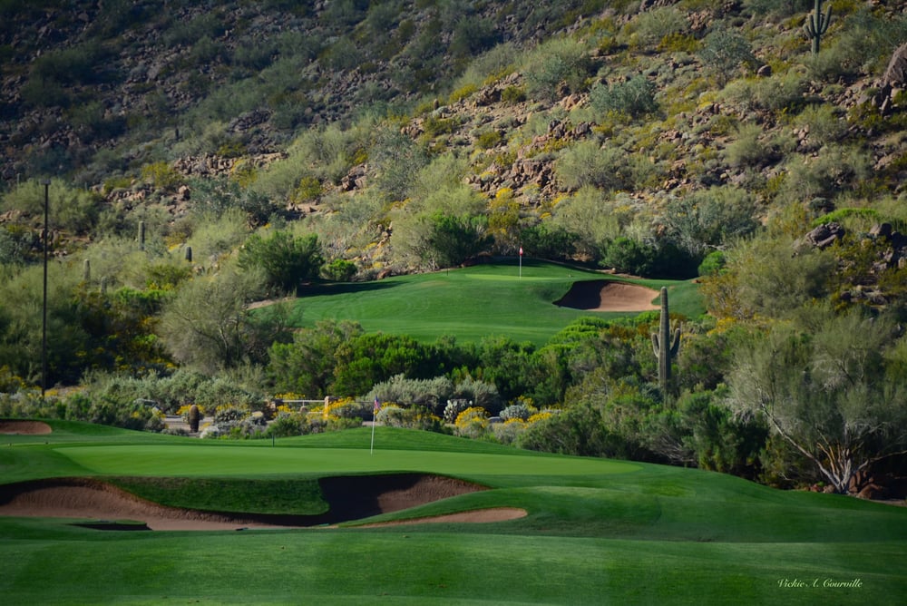 The first picture is of a Par 4 just below a beautiful Par 3 we played. The second picture is a take of the iconic Nipple Mountain.
