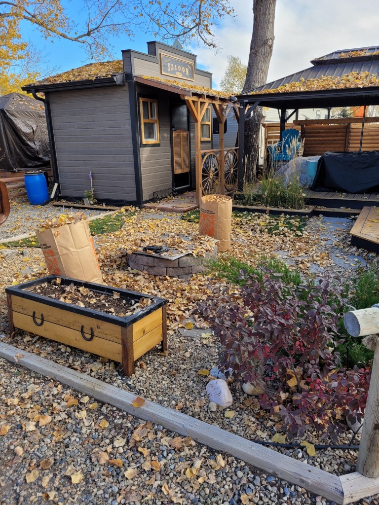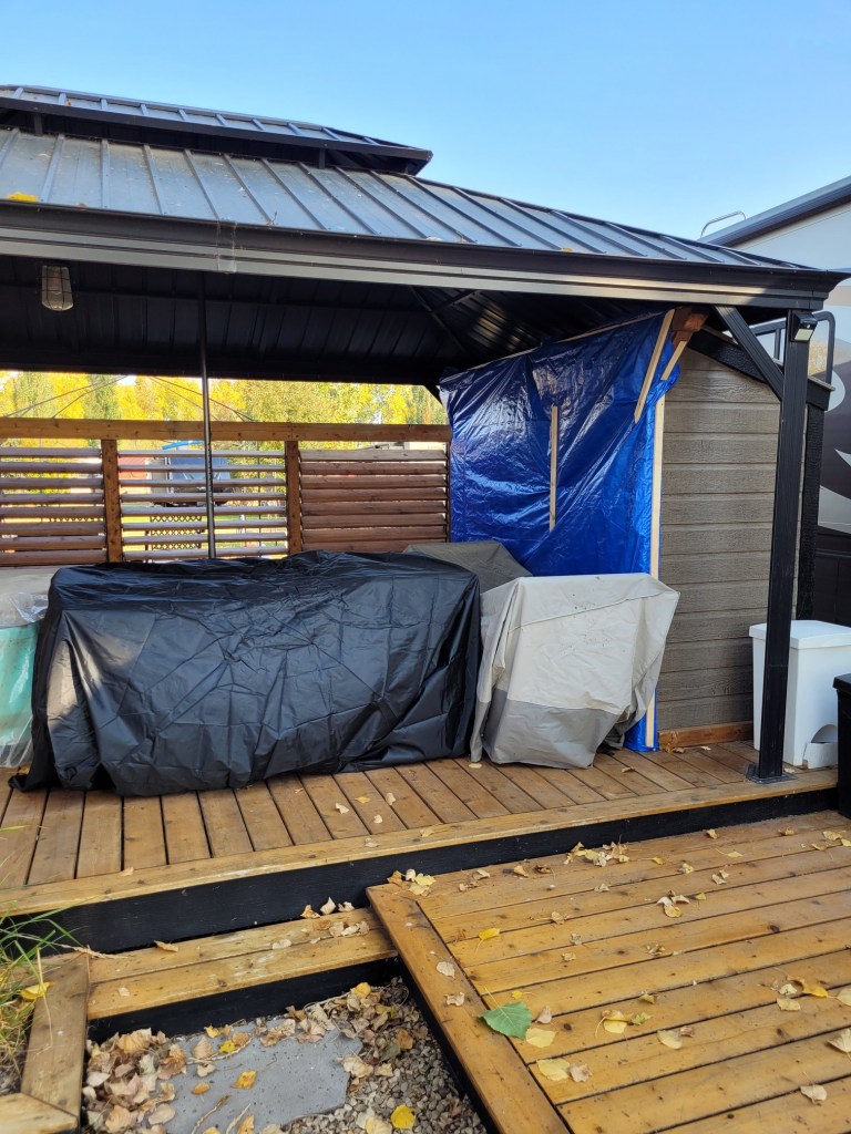 This morning I headed out the lot and spent from 10:30 to 5pm out there working. I worked all day and forgot to take a break as the temperature was so perfect to work. A full day. I blew out the irrigation lines with the air compressor. I pulled out all of the flowers and bagged the dirt and stems. I cleaned out the shed of all the liquids and paint plus all of the liquids left in the motorhome. I pulled in the slides and retracted the jacks. I picked out any clothes that I thought Jackie, or I may want. I pin nailed a tarp to the outdoor kitchen which a new way of covering for the winter. I like this as it is easier, faster and I think will work perfectly. I wrapped the balance of the furniture and put my new cover over the bar. I installed the center support pole in case we get lots of snow load this winter. I then winterized the motorhome. Again, I will say this unit drives me nuts with so many valves and the sequence. Two jugs later I was done. I removed the filter and drained the hot water tank. Lot of up and down and run to check taps etc but done for another year. I drained and flushed the sewer and put away the water hose, black water hose, electrical line and internet line.