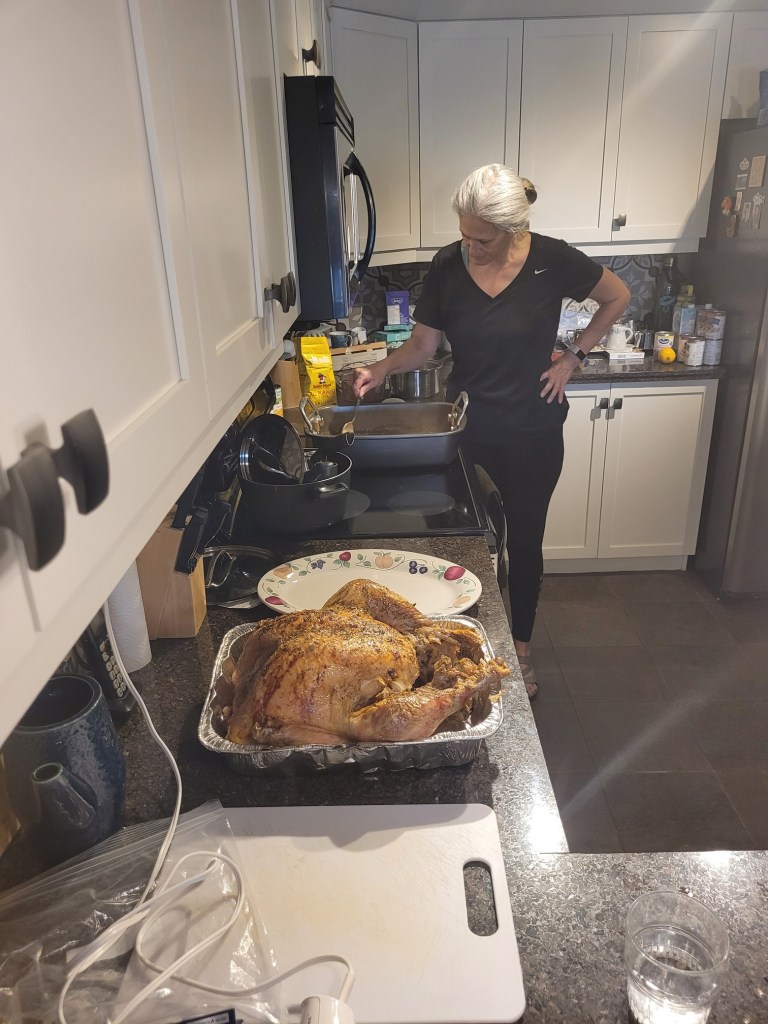 So today at 10 am I put the first turkey in the oven. Seasoned, buttered, stuffed and expect it to be ready by 3pm as I was using 350 degrees. Then on to the potatoes. We have one large pot that can hold 10 pounds of potatoes (we do have to be careful as they stick to the bottom if you don’t turn often.) Peeled and boiled. As I hate lumps in mashed potatoes this time, I used our ricer which we have had forever as it was a wedding gift. I have used it often. It makes nice and fluffy potatoes with no lumps. Tomorrow I just have to add butter and half/half milk and stir in, and we will have, hot lump free wonderful, mashed potatoes. I have stuffing in the turkey and dressing I make outside. I made this all up with my secret spices and ingredients and just need to reheat. Jackie carved up the birds. I add turkey broth in a tin foil cover and heat the turkey up and I guarantee it is a juicy as when first cut. We make the gravy (had to make a quick trip as we ran out of flour) and save it to reheat before our meal. Trick with any turkey meal is really hot gravy (microwave if needed) as it makes everything taste warmer. Tomorrow, we do not have to panic as we only have the vegetables to heat up and side dished like pickles, cranberries, pickled carrots and buns and salad to set out. The pricing this year is ridiculous on everything. I would expect a family of four would spend at least $100 on a meal. We have 18 people coming. I enjoy the cooking part without the rush time frames as I want to serve hot food. Desserts and salad are by others, and anything is fine EXCEPT we have to have pumpkin pie with whip cream to make it a proper Thanksgiving meal.