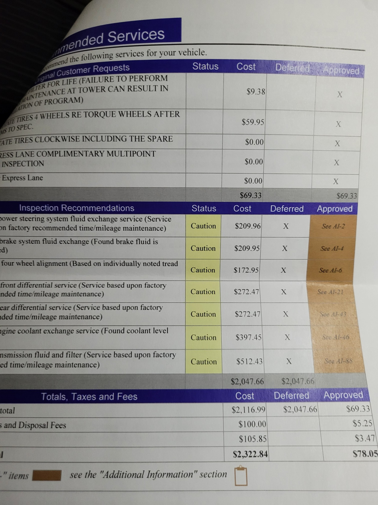 As usual they gave a list of repairs that totaled over $2k. If people fall for this, they are just stupid. I follow the manufactures and NEVER pay heed to the dealers upselling. If I added up all of the charges, they wanted me to buy I would have doubled the price I paid for the Jeep. One word fits these dealerships. CROOKS!