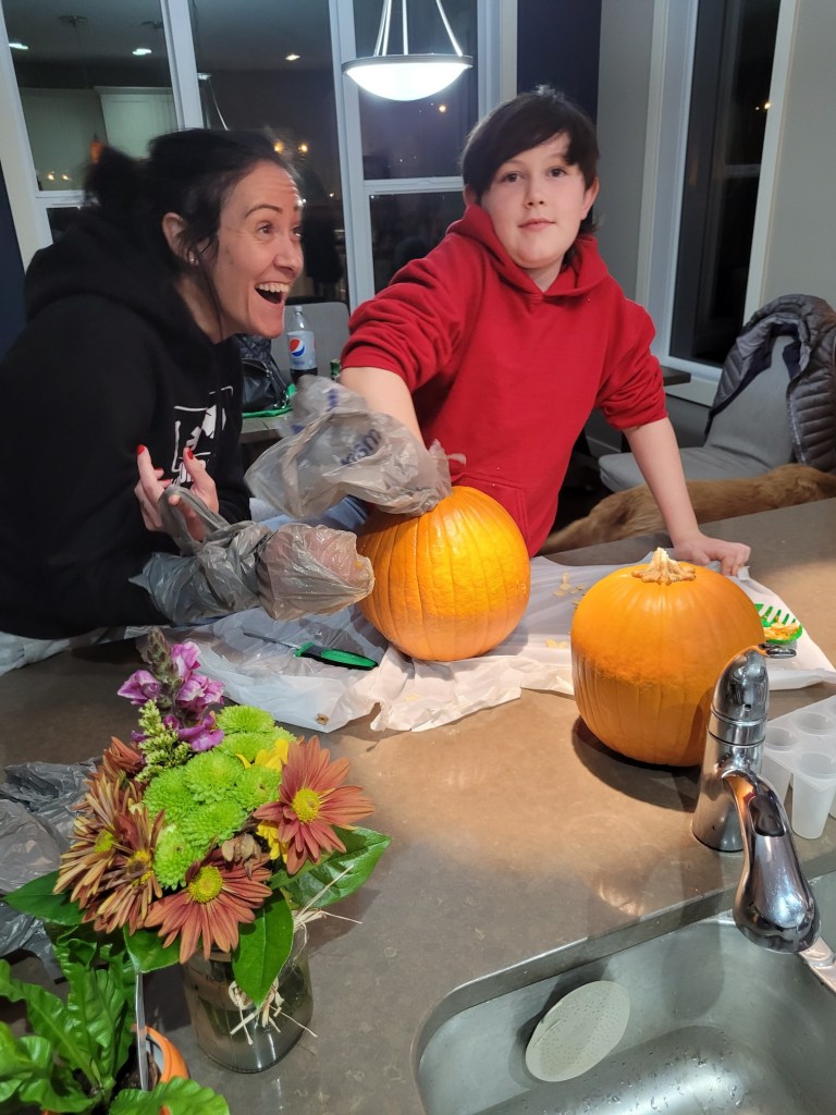 This is funny. Like mother like son. The feel of squishing pumpkin guts thru yoru fingers is wonderful. Jackson and Tor wore “made up” gloves. LOL