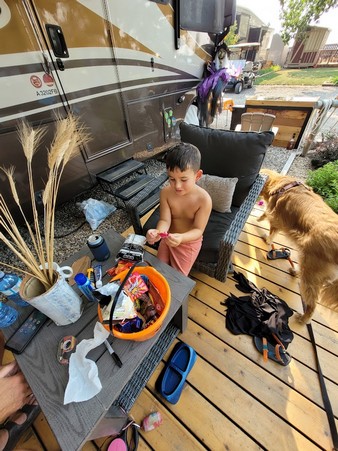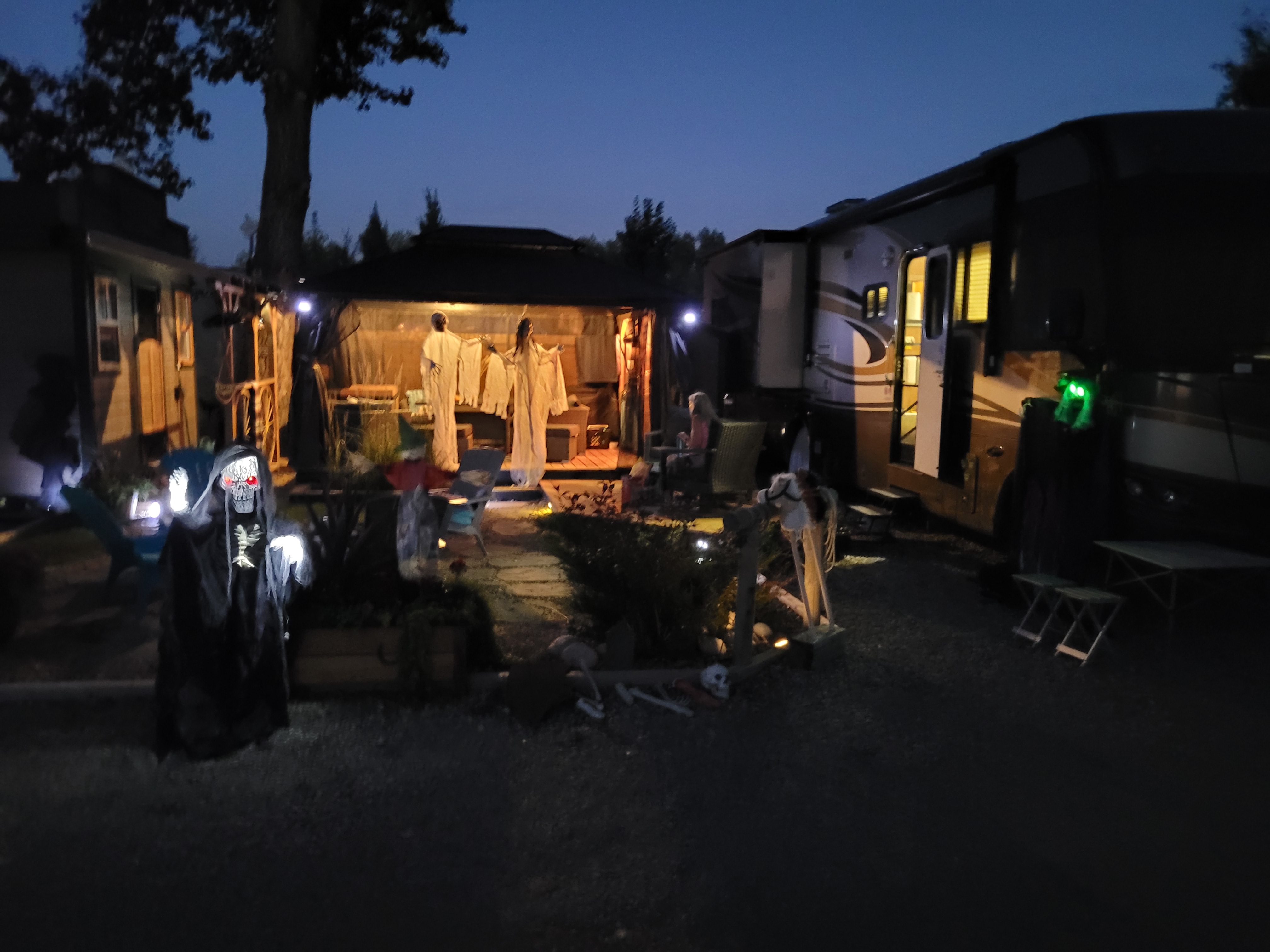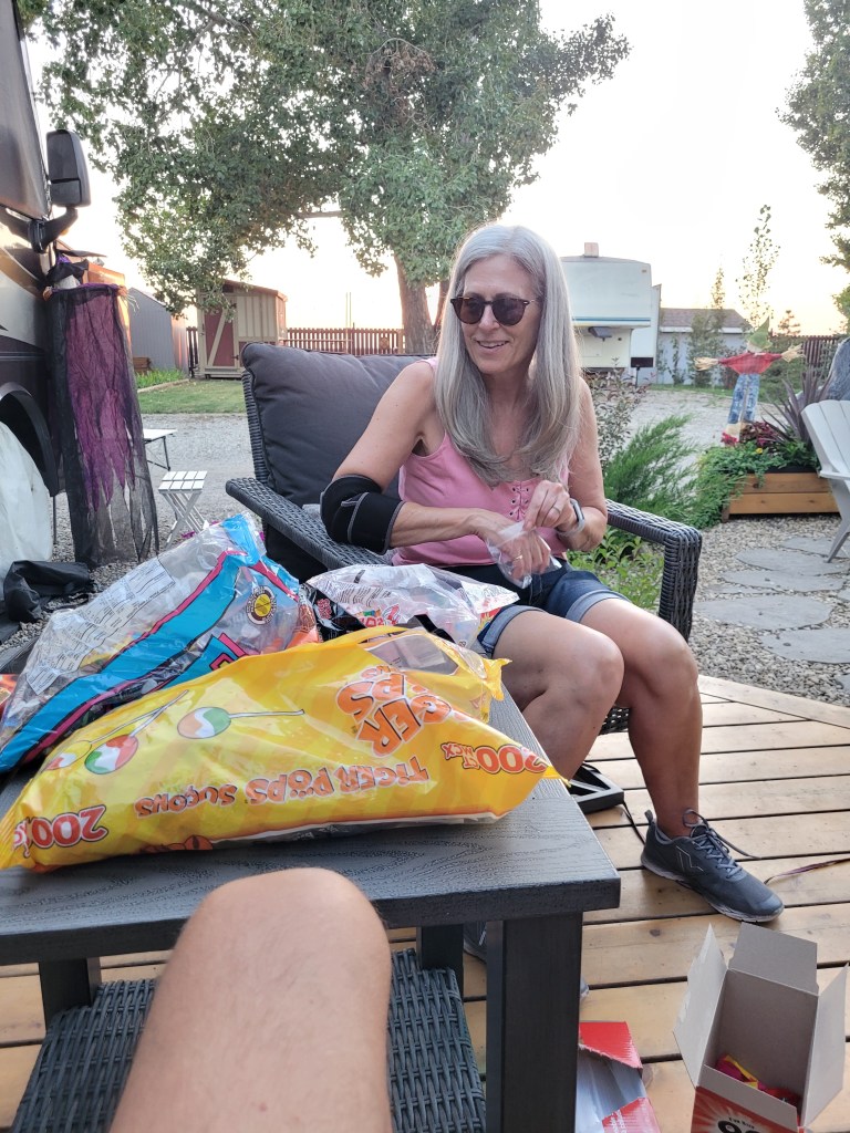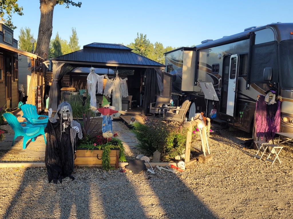 We arrived late Friday afternoon after picking up groceries. What a beauty of a day. We cleaned and organized in preparation of the weekend. After losing to Jackie getting Wordle in three we decided to set up decorations. Our plan works great as we share the decorations with Tor and add to it each year. I hung them up and they look great. Now candy handouts are before dark which I hate as the kids don’t get as scared but it makes it nice for them to be warm and not too afraid. Speaking of warmth at 33 degrees a kid in a costume is going to struggle.