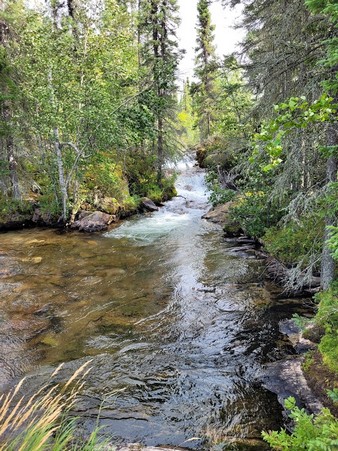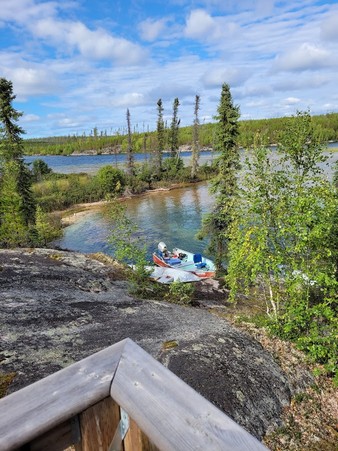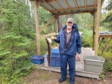 Lake- a beautiful place in the world. A smaller lake where I will guess it is about 5 miles long by 3 miles wide ( no info on the net about this) It has crystal clear water, no weeds, no algae and appears not to be too deep in center. It the MOST DANGEROUS lake I have been on though especially with wind. Rock lines edges and multiple protruding boulders just under the water or just breaking the surface that are very difficult to see. In fact our host who has fished this lake for 26 years hit his prop 3 times and we hit ours once. Alfred straightened them by removing them and pounding them straight and filing. Huge boulders lining the edges as we entered and existed the river feeding the lake. On the east end of the lake there is one smaller sandy beach. There are only 4 cabins on this lake. One of these is a large house and a owner with bundles of money. He has the sandy beach. We stopped over to check it out and he has a Pontoon leisure party boat with a 150 hp motor, two 16ft alum fishing boats decked out, a Kubota backhoe tractor and a skid steer all on his property that all had to be flown in by helicopter or plane as even winter access isn’t really available. He even had a wood fire heated hot tub in the back yard. He is living the good life for sure. The lake has a river and a waterfall entering it. The rich cabin guys even built a lookout deck above it.