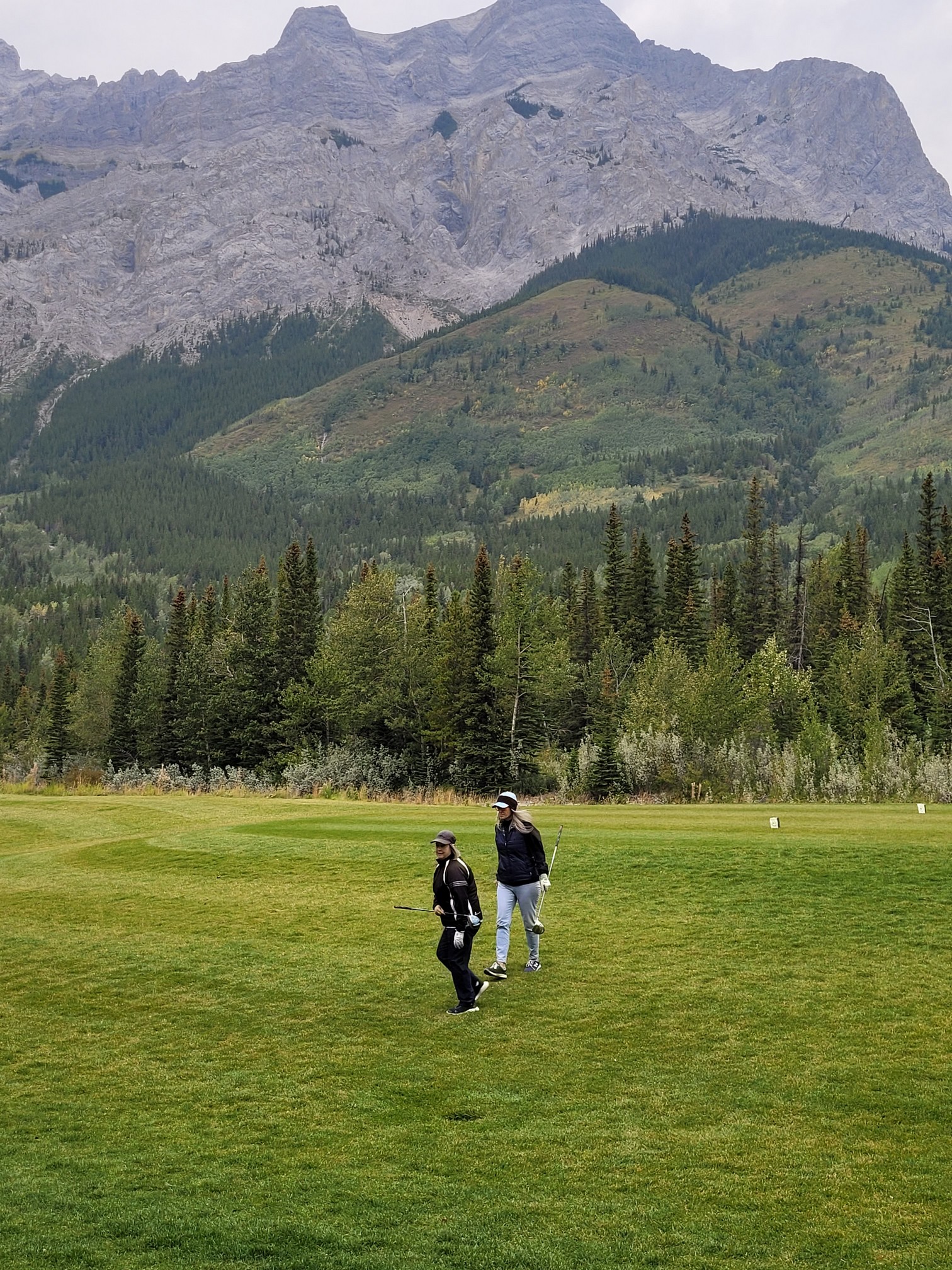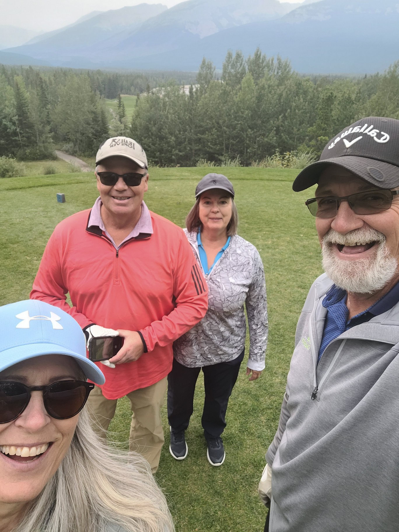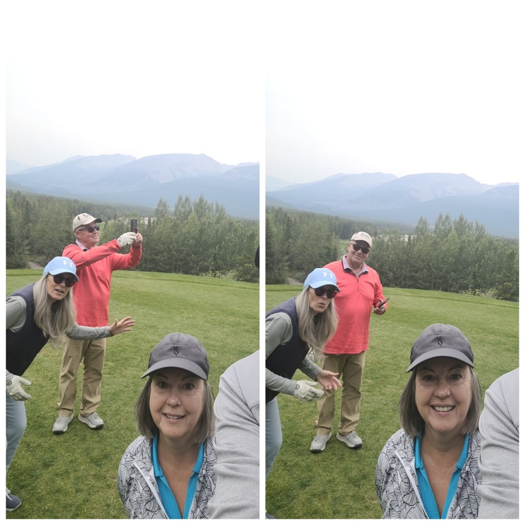 Today we were heading out to Kananaskis for golf with Jeff & Wendy. We loaded everyone up in the car including 10 water bottles and I decided to take 22x to avoid construction. It was a nice drive out there. The weather stated it was to hit a high of 17 on one app and 22 on another. I was the only one wearing sandals and shorts. IT IS SUMMER. Being a Alberta Senior the rate is very good for the quality of course. I hadn’t golfed for at least 10 days and still had my sore back muscle so I didn’t expect great things. I did ok but not great. The wind came up and really chilled the air. I was warm enough but I did need to put on my wind breaker and it was cool enough my Reynaud’s acted up so I had to use pocket warmers. My finger go pure white and numb. Weird thing really. I had a customer at Logic Lumber who used to wear gloves even in the summer in the office.