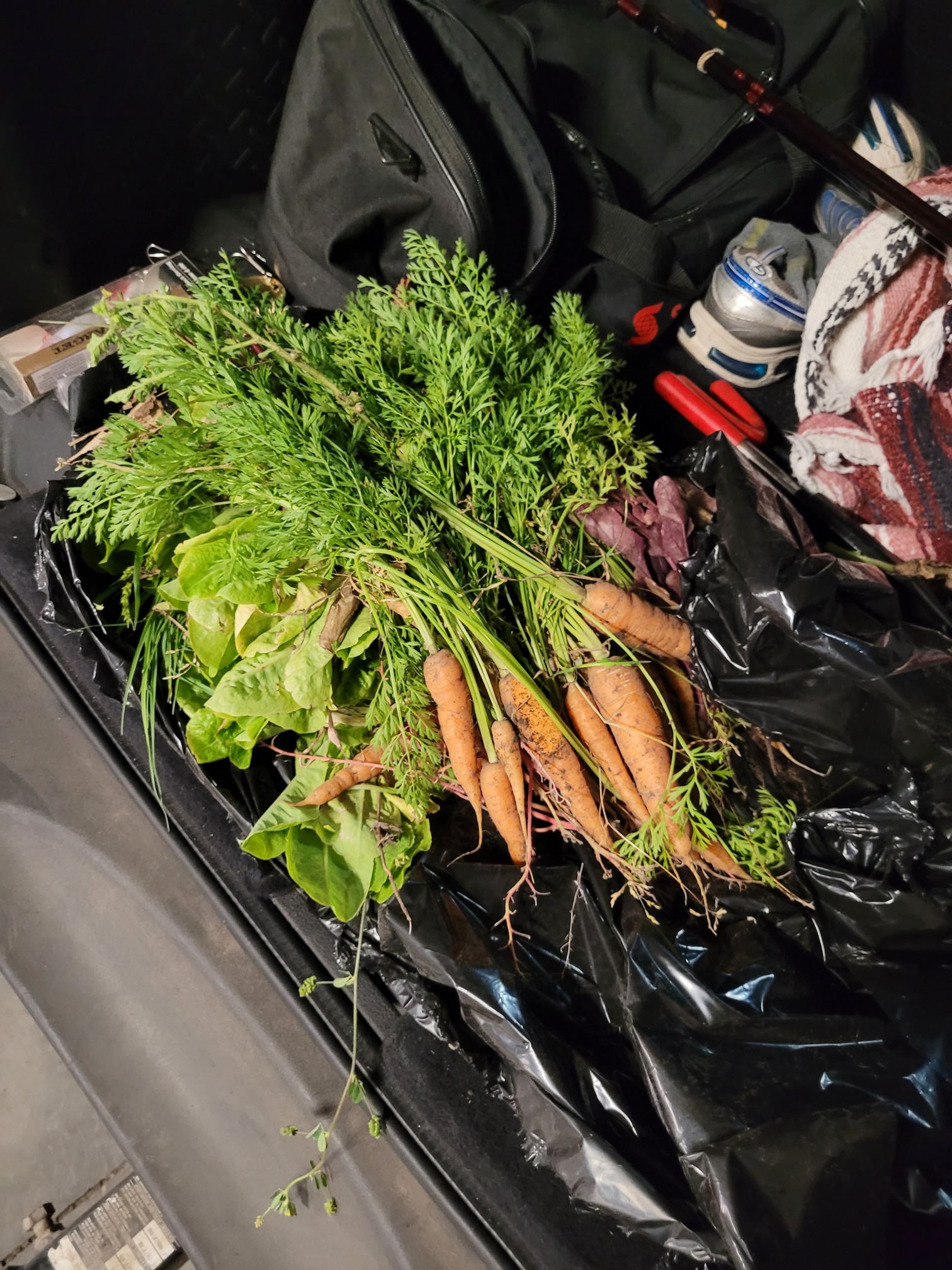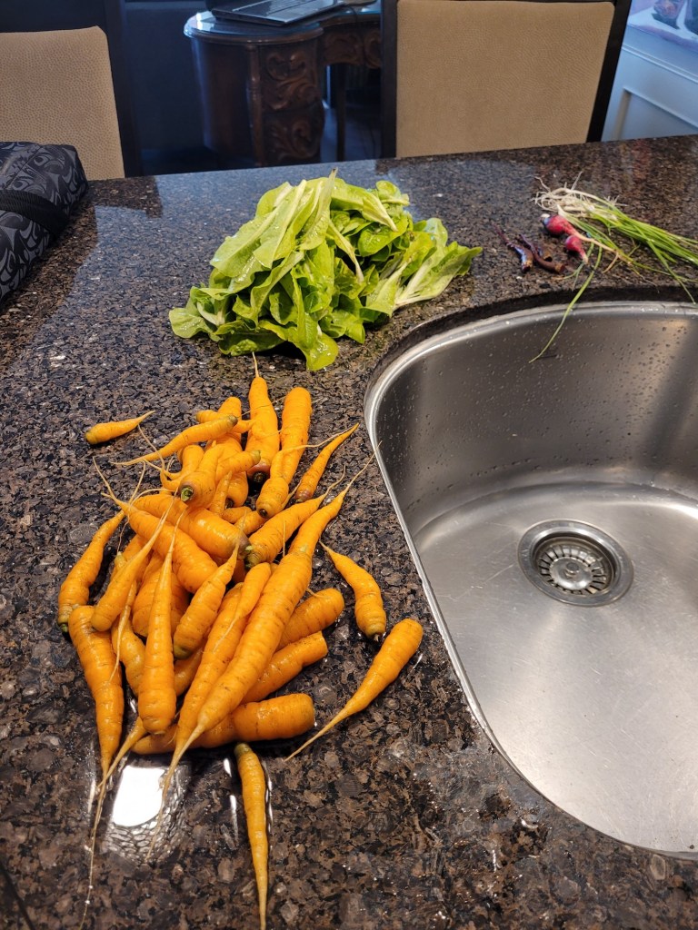 I did the end of season cleaning on the garden. I loaded up my cache to bring home to wash them all up. The carrots are the perfect size. I brought home carrots, lettuce, leeks, and radishes. Not an over abundance but the soil I will make sure is a lot better next year.