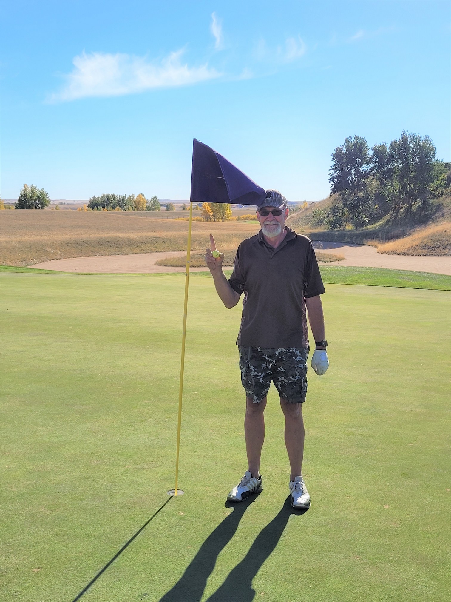 HOLE 14 at 134 yards elevated tee box and sand bunkers all in front was the scene of my SECOND HOLE IN ONE. 6 inches in front and then in. A marvelous thing. I told my partners which all were excited as it was their first hole in one they have seen that my middle name was KIM and just like Tom Kim at the Presidents Cup I had to dance. LOL