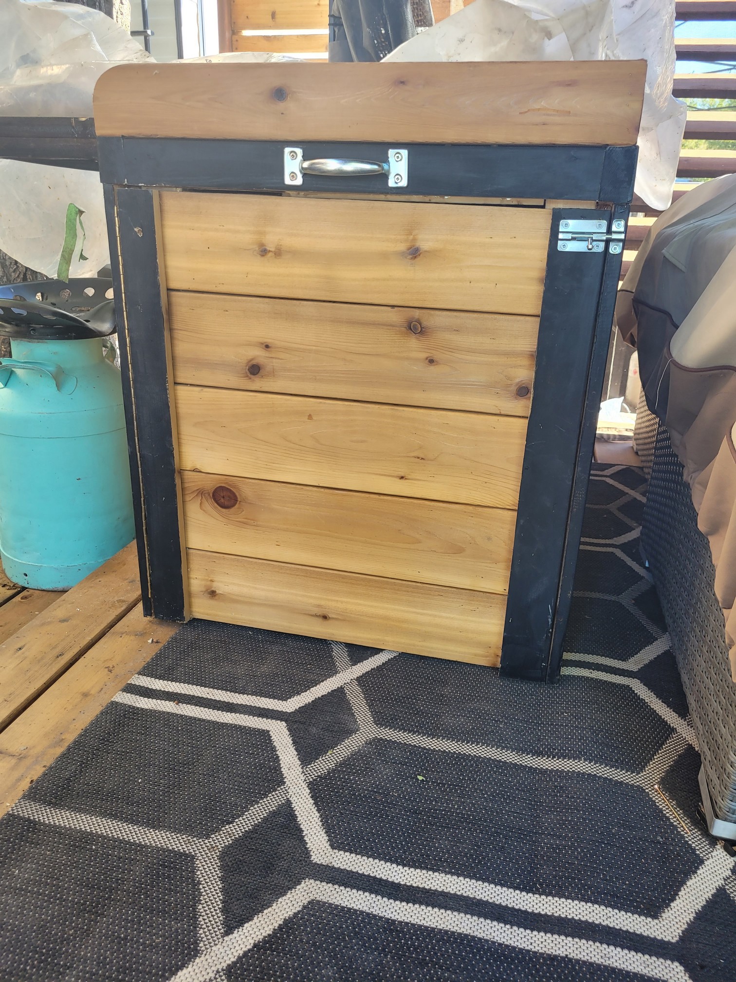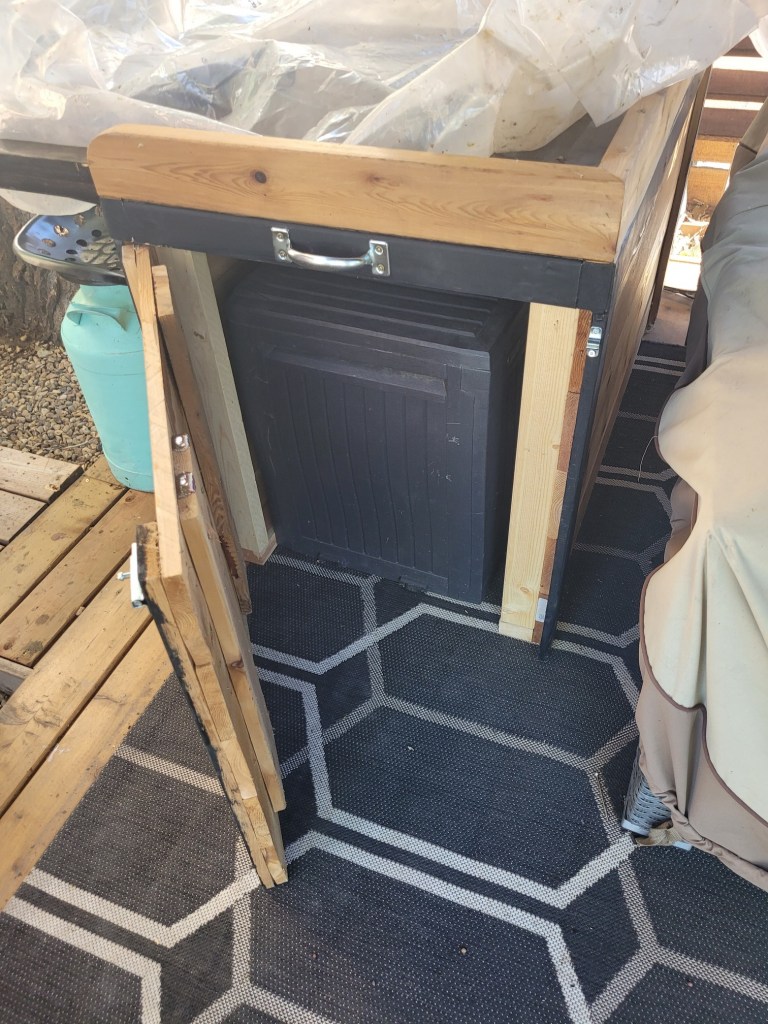 I headed out after coffee and catch up, to the lot today to get some more work done. I made an entry door, continuously hinged it, barrel bolted it and applied handles. I had to pull out the table saw to trim down my door to fit. Now it still looks great, and we have an access panel to a resin box to store cushions and covers in. Love it!