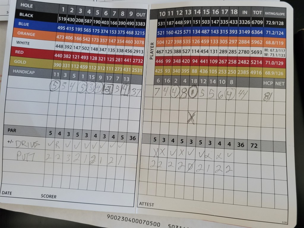 Great day and a lot of fun. Some great shots and poor shots by everyone. Wendy was a hurting unit and shouldn’t be playing she is so crippled. I played very well today scoring low 80’s and that is with 6 -3 putts. I NEED TO GET BETTER AT PUTTING. I read correct or believe I do, normally have the weight correct but I do find with the progressive lenses I struggle to see the hole accurately. I could remove my glasses for putting but it takes too long for my eyes to adjust back to no lenses. I will figure it out. Another 70’s game wasted due to one thing. Putting !