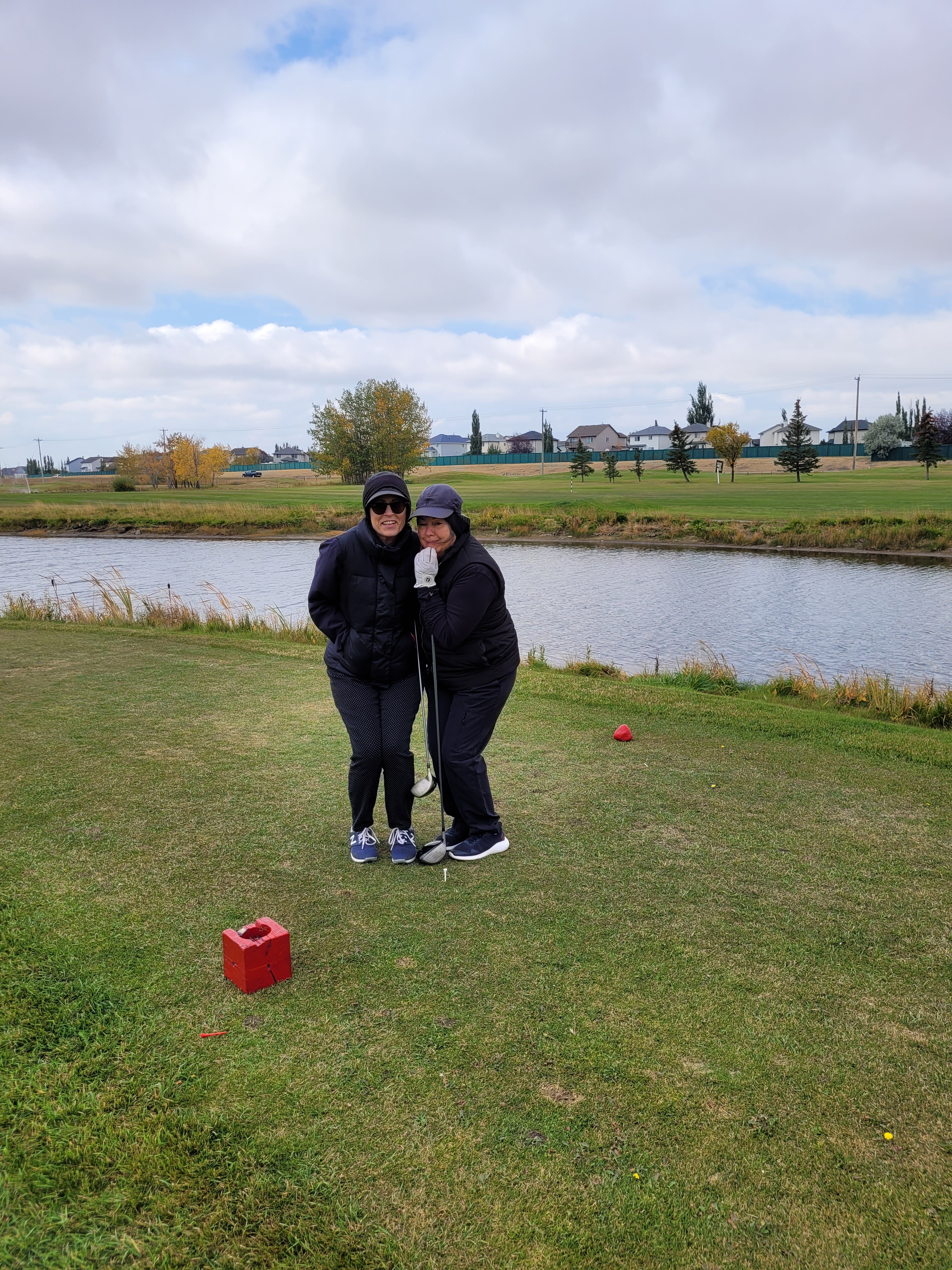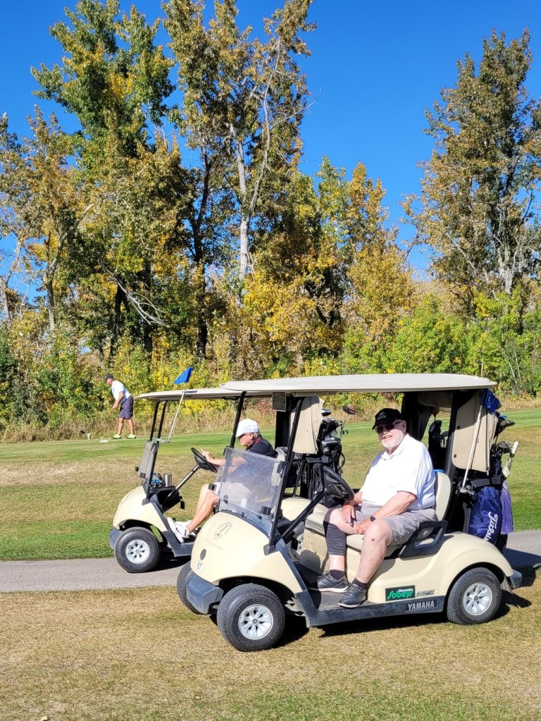 While it is now fall it is really still summer. 19 degrees is wonderful. Today we were golfing at Murfield Lakes in Lyalta. The day started off a little overcast but soon the sun started to shine brightly and it was very nice. Now remember we are in Southern Alberta so wouldn’t you know it the wind started up and it cooled down a few degrees fast. It stayed windy for most of the game which is unfortunate but still overall a beautiful fall day. I was the only one wearing shorts again. Why?