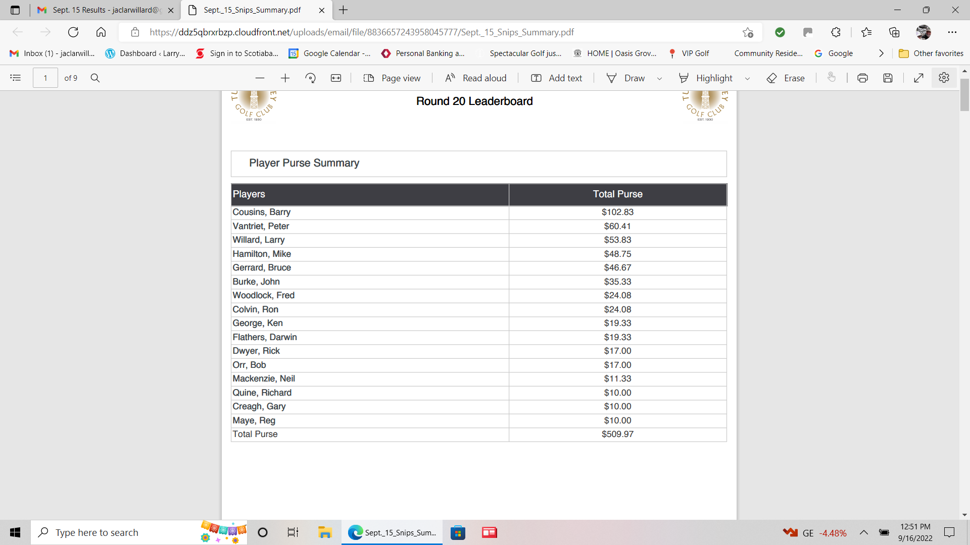 I golfed very well the front nine and would have been below 40 expect for an error. The back nine I feel apart on. BUT i won big money again today and am just waiting the for the money purse list to show me my money.