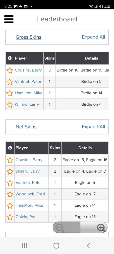 Here are my money winning holes. I have a Gross Skin Birdie on #4, I have a Net Skin Eagle on #4 and a Net Skin Eagle on #7 and Deuce on #7. We had 40 players this round so I am hoping about $60 or so. Time will tell.