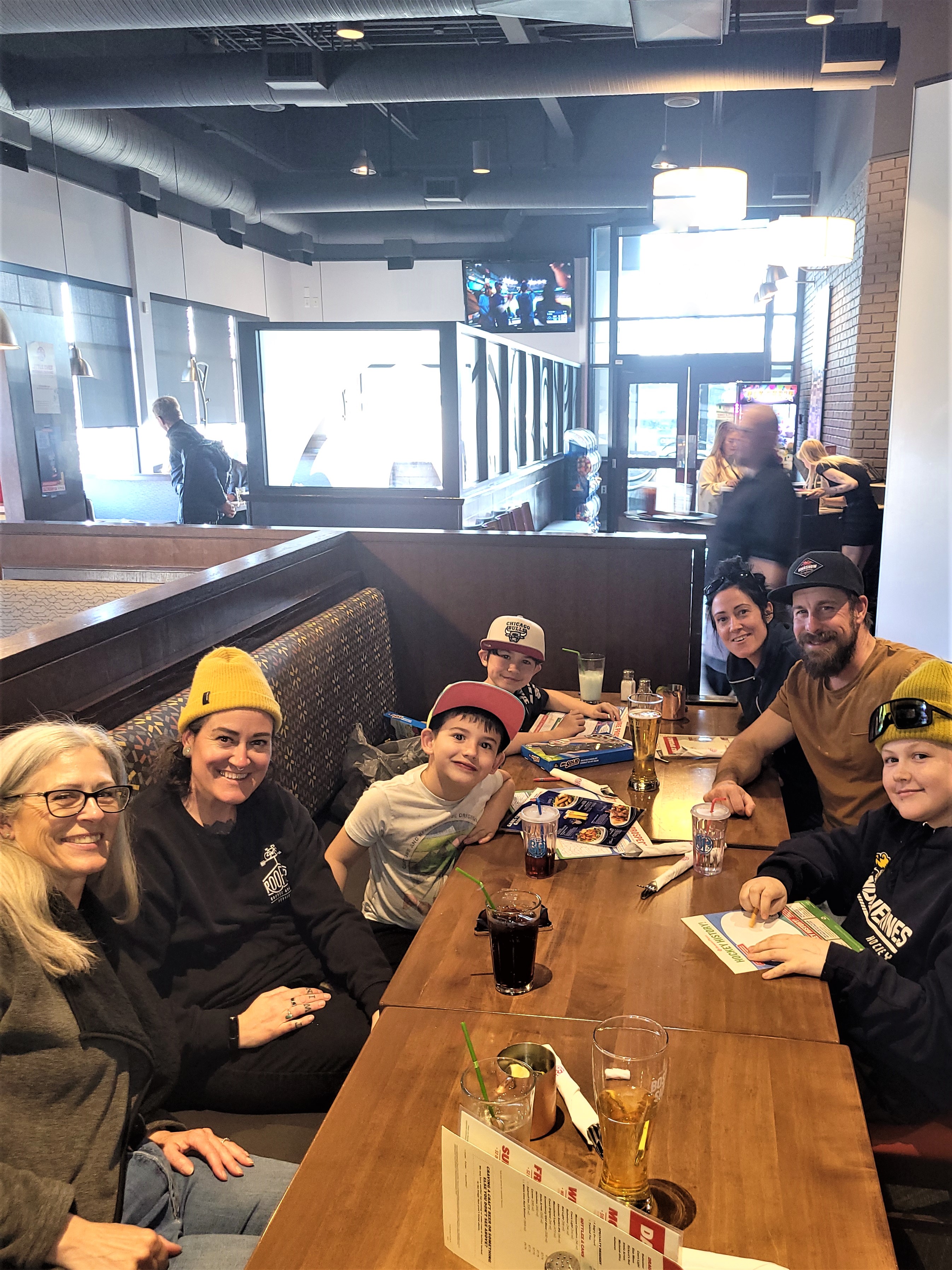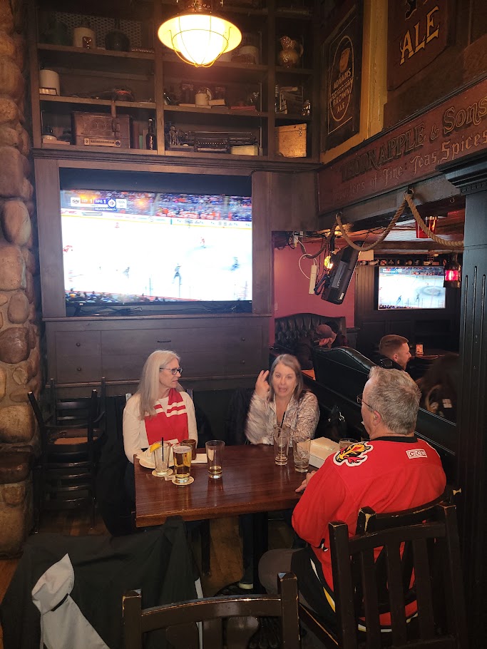 Jackie and I met the Graces at Dixon’s. We like this spot as they have lots of TV’s, great food and they let you reserve a table. And Jeff always seem to get his favorite table. They know him. He also has been very lucky here winning over the years a Flames Jersey and a Juniors jersey.