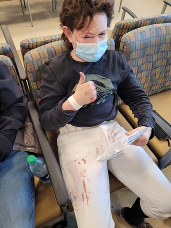 Then it was his turn to bat. Every kid got 20 chances to hit from a pitch. No kid before Jackson was able to make contact with the ball more than once. Jackson had three good contacts batting the ball well. Then our day got long. A pitch and Jackson takes a good swing at it but the ball just catches the edge of the thin neck on the bat and come straight up into his face. No chance to move. It hits straight in the eye and he falls saying “I can’t see” and blood pouring down his face. He was cut just above the eyelid and below the eyebrow. The other kids when they saw the blood were in awe. Jackson was extremely brave as they worked on him getting ice packs and trying to clean up blood. We drove him right to the emergency.