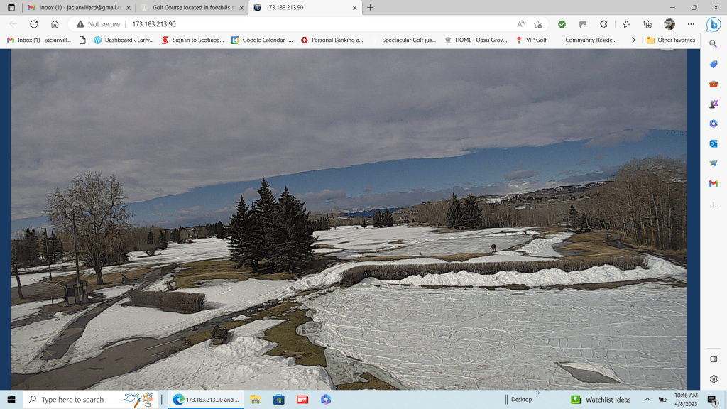Here is my Turner Valley Golf course today and you can see brown starting to peak thru and two guys working on the greens/tarps which is a good sign.