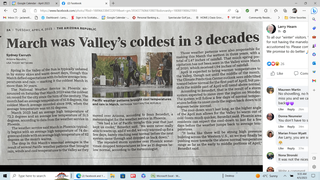 And it was. I went thru 4 tanks of propane for the patio heater and even then, it was too cool to spend a lot of time outside. Having said that we only had about 4 games cancelled due to rain, and we were able to still enjoy the sun albeit a cool sun. I am looking forward to a “normal” Mesa wintering this fall/spring. No covid issues and getting back to great weather. Normal taken a long time to achieve. Plus we need inflation to go away. Things this year were ridiculously expensive including golf. My VIP golf membership is excellent compared to the USA pricing. Even Viewpoint this year for a non-resident was over $100 rack rate. Things overall have changed as pricing in Canada is now pretty close to the USA when exchange is factored in on just about everything except for alcohol.