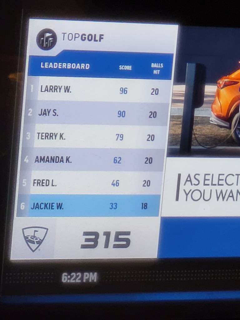 Fred & Terry picked us up along with their daughter Amanda and her fiancée Jay and we headed to TOPGOLF. We all had a blast. I was impressed with Jay’s golf swing as he had some great hits. I threw down a buck bet on the farthest drive but disappointing to me I lost. One shot each and I hit the mat just before the ball. I loved the place, but they need longer tees. They were a way to short for a driver. Jay beat me !