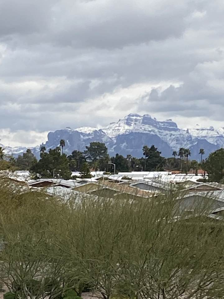 Here is the interesting thing about Mesa AZ . Beautiful sunrises and sunsets and warmth touched by snow the odd time. These pictures are of the Superstition Mountains just a few miles away from our park.