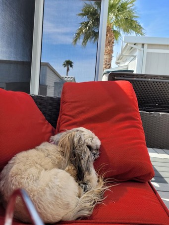 Daisy and I after working all day spend the late afternoon in the sun on the back patio. A great day.