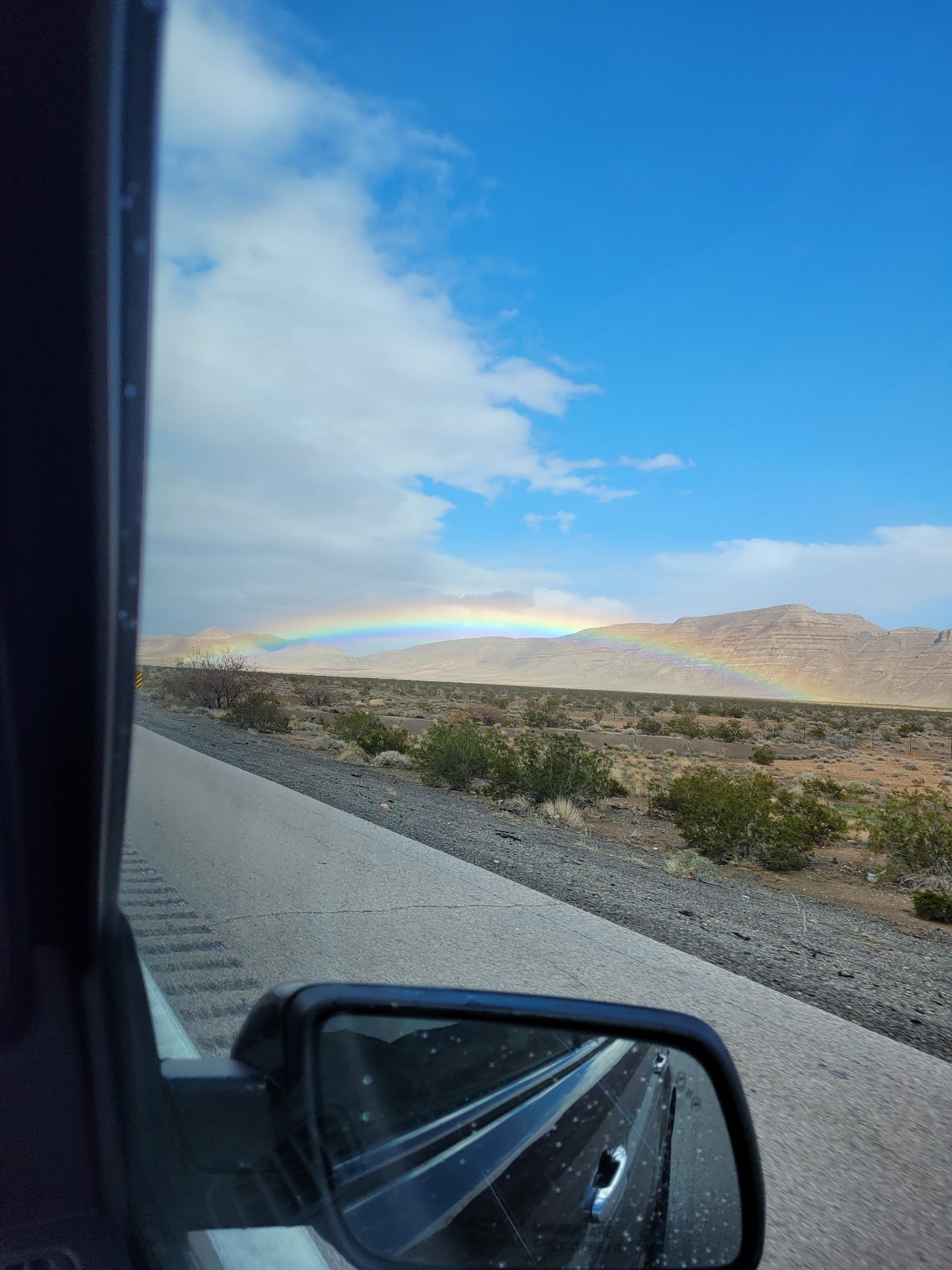 A huge rainbow. We actually saw it where it touched the ground. No time to stop. Darn!