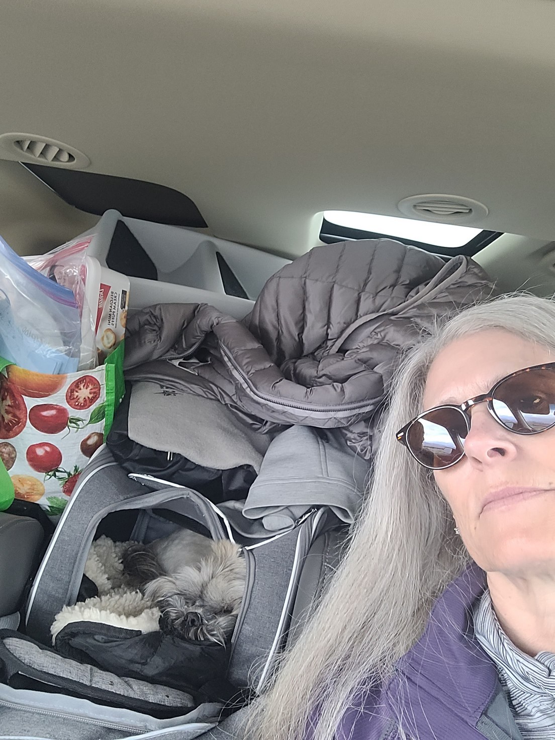 Here are my travelling partners enjoying the ride. You can see the car packed to the ceiling. I would guess at least 500 pounds of stuff. Jackie with one eye on the road.