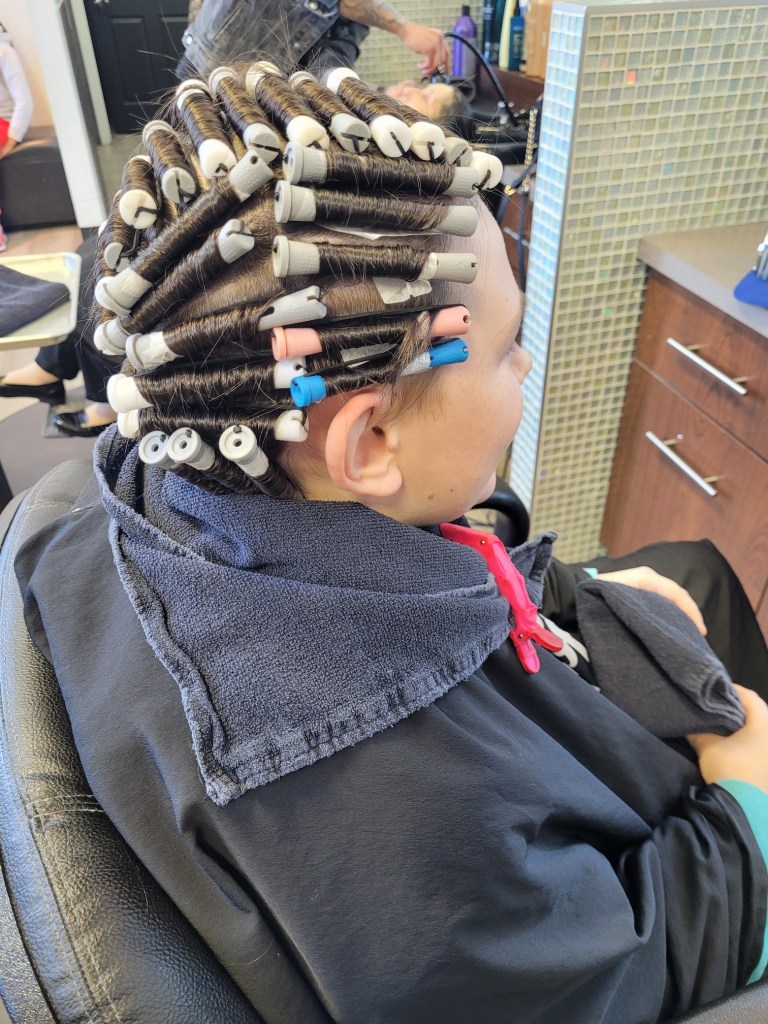 Jackie took Jackson to get his hair done yesterday. Not cheap to have someone put rollers in your hair. LOL I was teasing Jackson that is how I lost my hair.