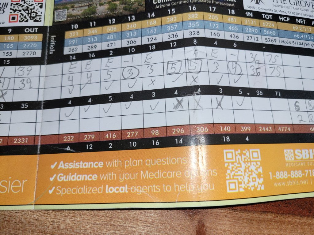 As golf goes it wasn’t a stellar day score wise. i had par after par then I got hit with 2 sand traps taking a 8 and another 8 from them. Once that happens the total game score is shot so the importance of a low score is gone. I LOVE my driver and had some fantastic shots and great second shots. So, a fun fun day with a nice group of guys in the sun playing golf how can you complain. The score sucked LOL Oh well.