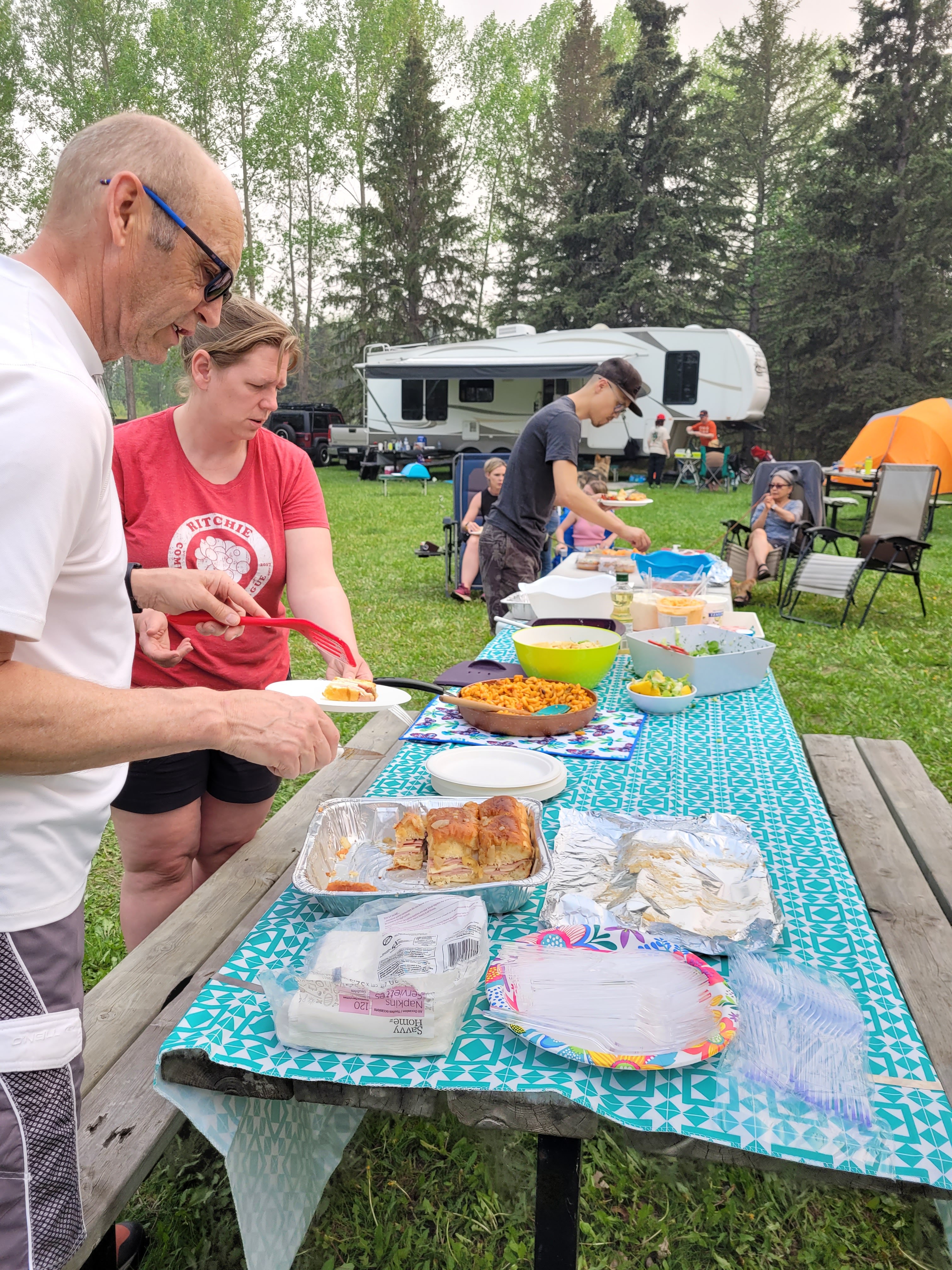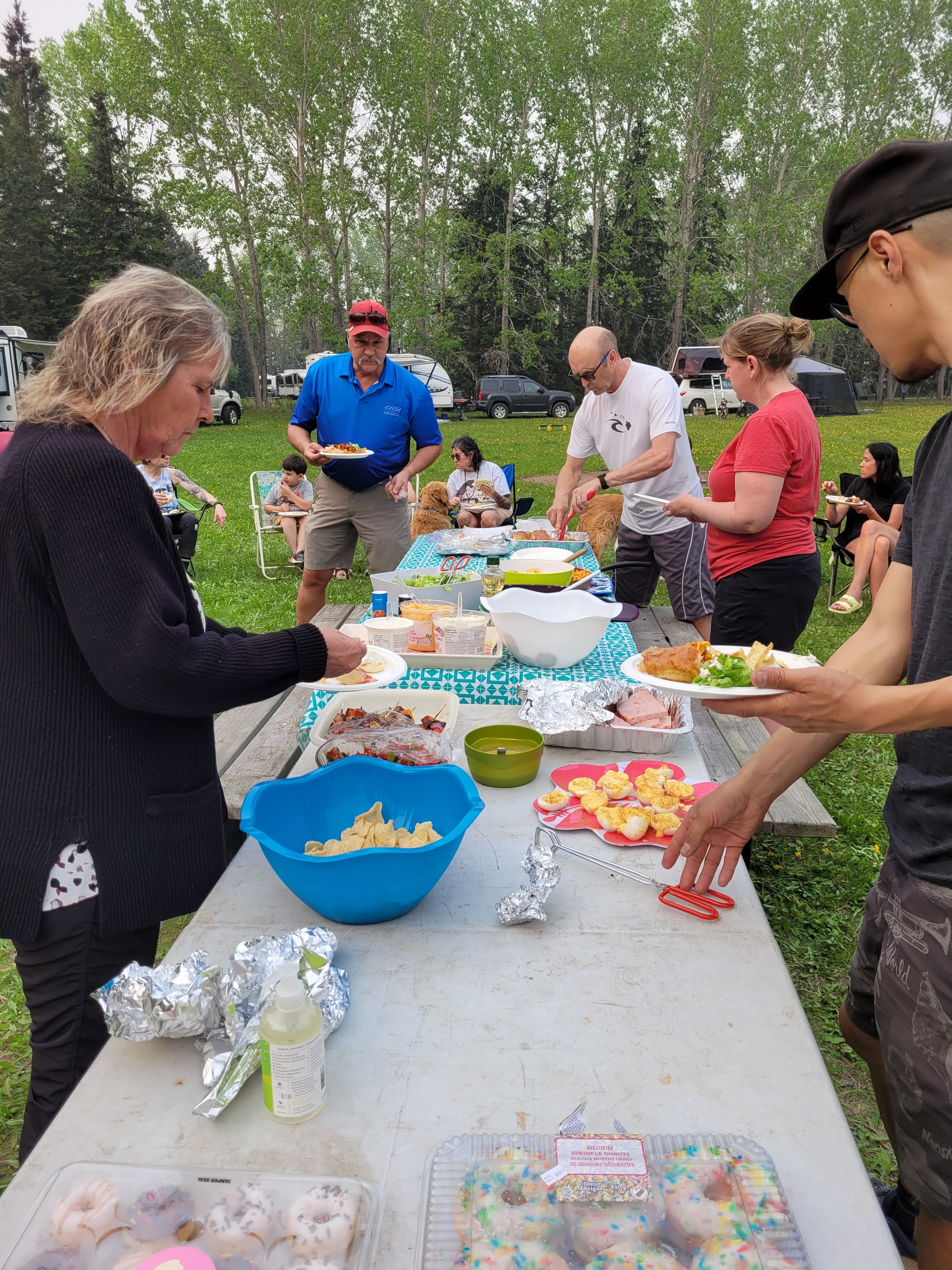 Our potluck theme was Greek and wow did we have some good food. There was no reward for food but Jason’s donairs were amazing. We had Greek salad, Ceasar drinks, pasta, chicken skewers, ham, devilled eggs, pita bites with sauces, doughnuts, and many other wonderful tasting foods. I was full as everyone was.