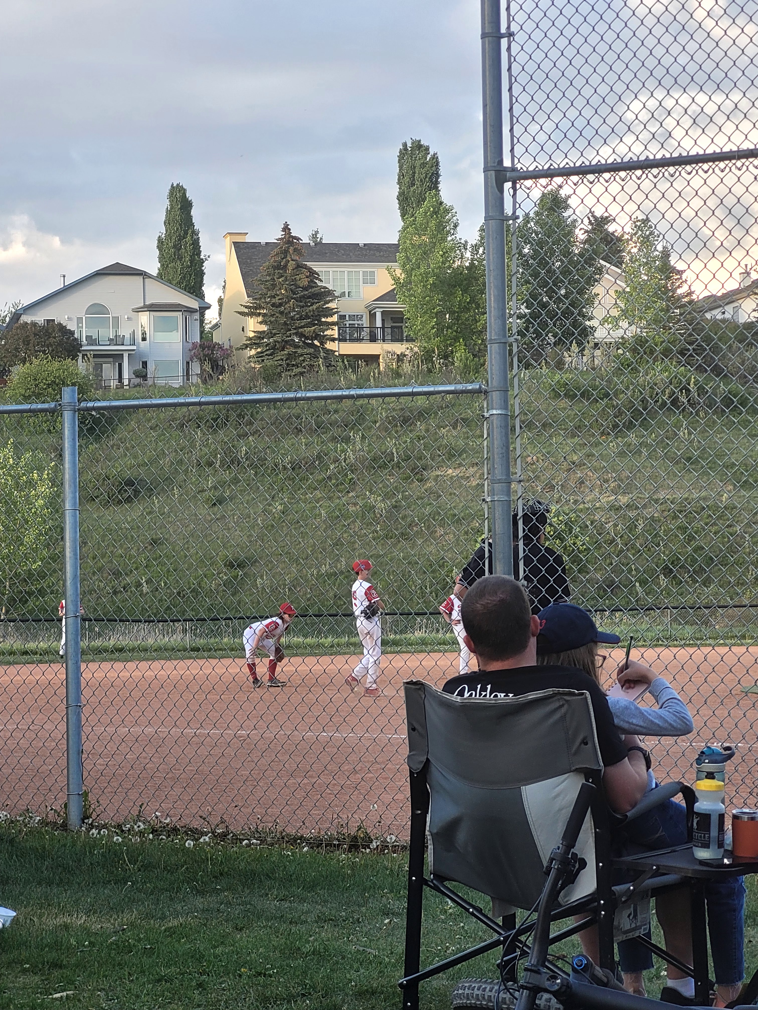 We took in one of Jackson’s ball games last night. They are fun to watch. When we walked into the park Victoria was sitting with Hazel and Corey right behind the back catcher but it has a high 15 ft fence to catch the balls. I said to them you are right in the strike zone for a fowl ball. They said no problem. Turns out I think they are trying to KILL me. A foul ball comes over the top, Tor and Jackie say or warn nothing, Corey says it is behind us but as I watched it fell fast. I jumped out of my chair and sure enough it hit smack in the middle of my chair. Attempted murder if I got a good lawyer. Great reaction time considering multiple Tylenol and a strong antibiotic in my body. Jackson after the game laughed about it.