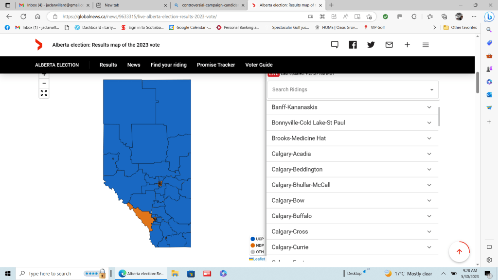 Election. Just a couple of short comments. First excellent for the UCP to win another majority. Not an overwhelming majority but still a major win. Any government that has gone thru the Pandemic, it is hard to appease the general public. We were lucky the NDP were not in power.