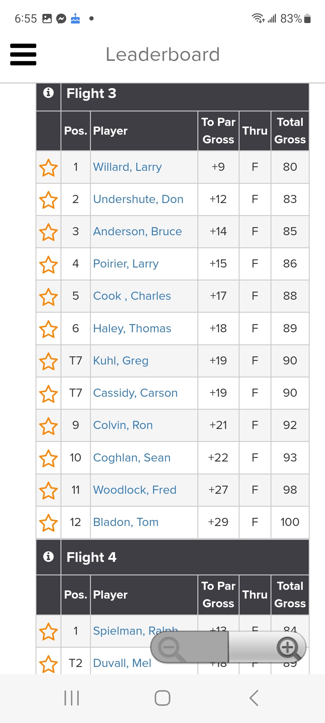 28 degrees and no wind today was perfect. I took one extra pill today as my back hasn’t got to the point yet of being great. I was golfing with Donn Smith, Rick Quine and Larry Poirer. I have golfed with Larry a lot and he is always one guy I want to beat. He is a better golfer than I so I always look forward to the challenge. If I could eliminate a few mistakes, I golfed wonderfully today. It just feels so nice when everything come together. I BEAT LARRY easily by 6 strokes but better yet I took his money and my playing partners all lost to me. Add to this I won close to $100 for my flight with LOW GROSS, LOW NET, 2 DUECES, and a NET EAGLE SKIN.