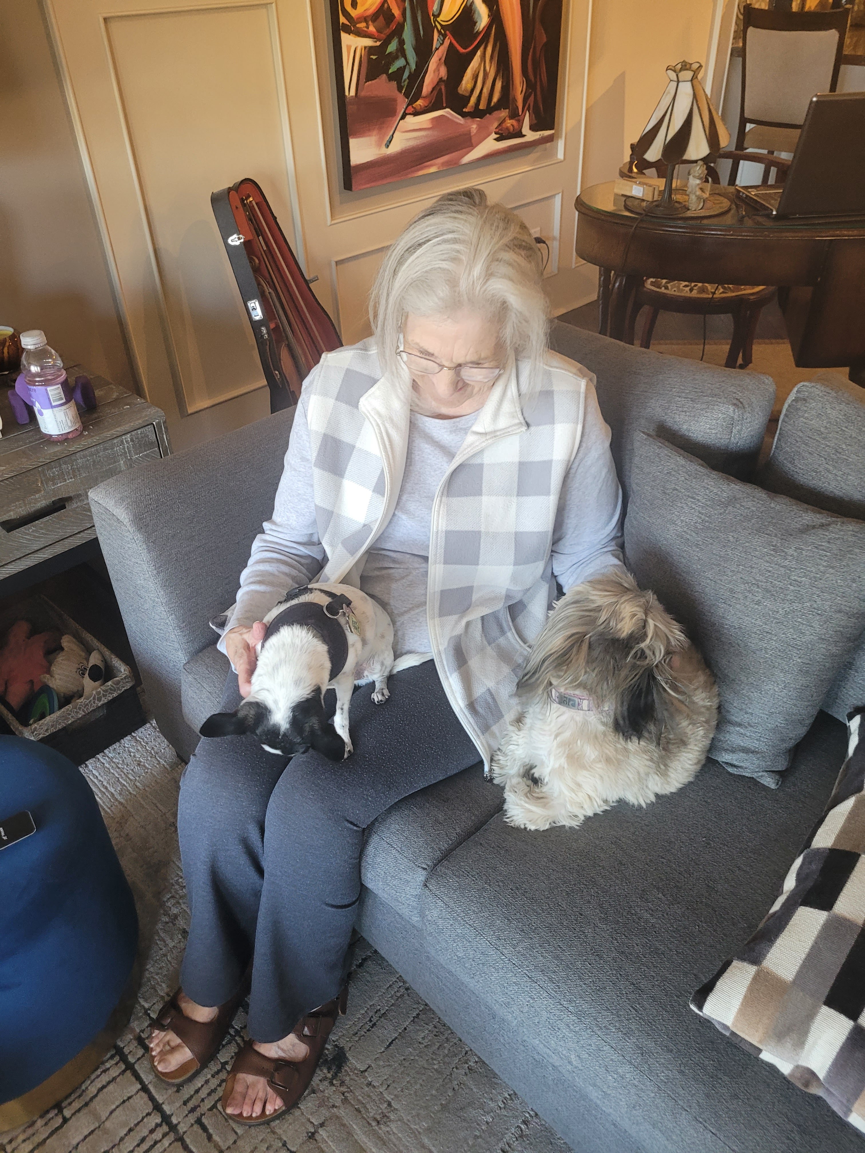 When Tia first got here it was a fight for attention from Audrey. Pushing up against, rolling over, and kisses. I think both the dogs and Audrey loved it.