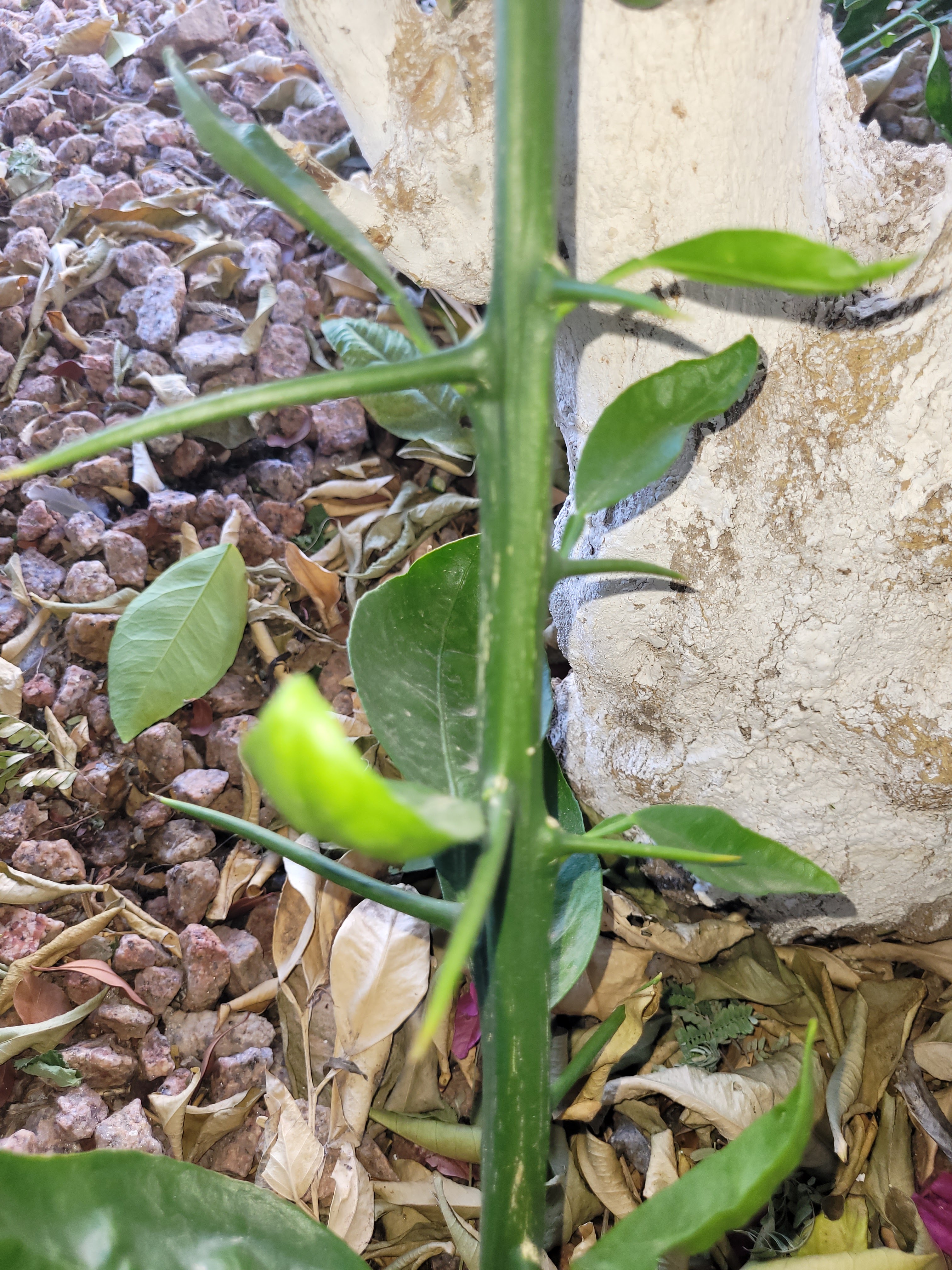 The world is an angry place right now as are the desert plants. I usually see 1 inch or a bit longer thorns but this year 3 inches plus. They are just mean. This is from my orange tree which is usually less mean than the lemon.
