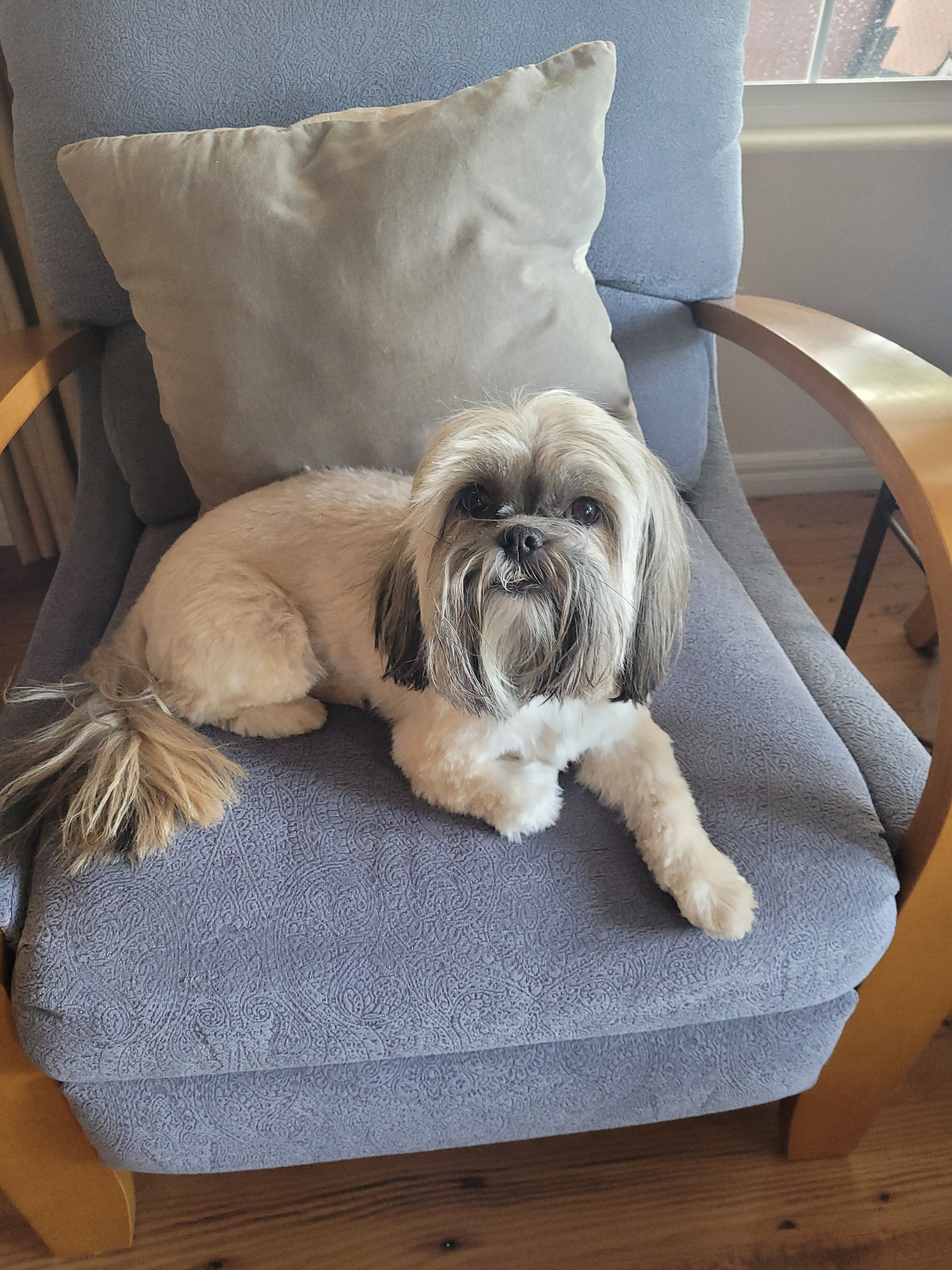 Here she is taking a break late afternoon sitting behind the sun shades. 80 degrees and it feels 10 degrees cooler behind them. I love this spot.