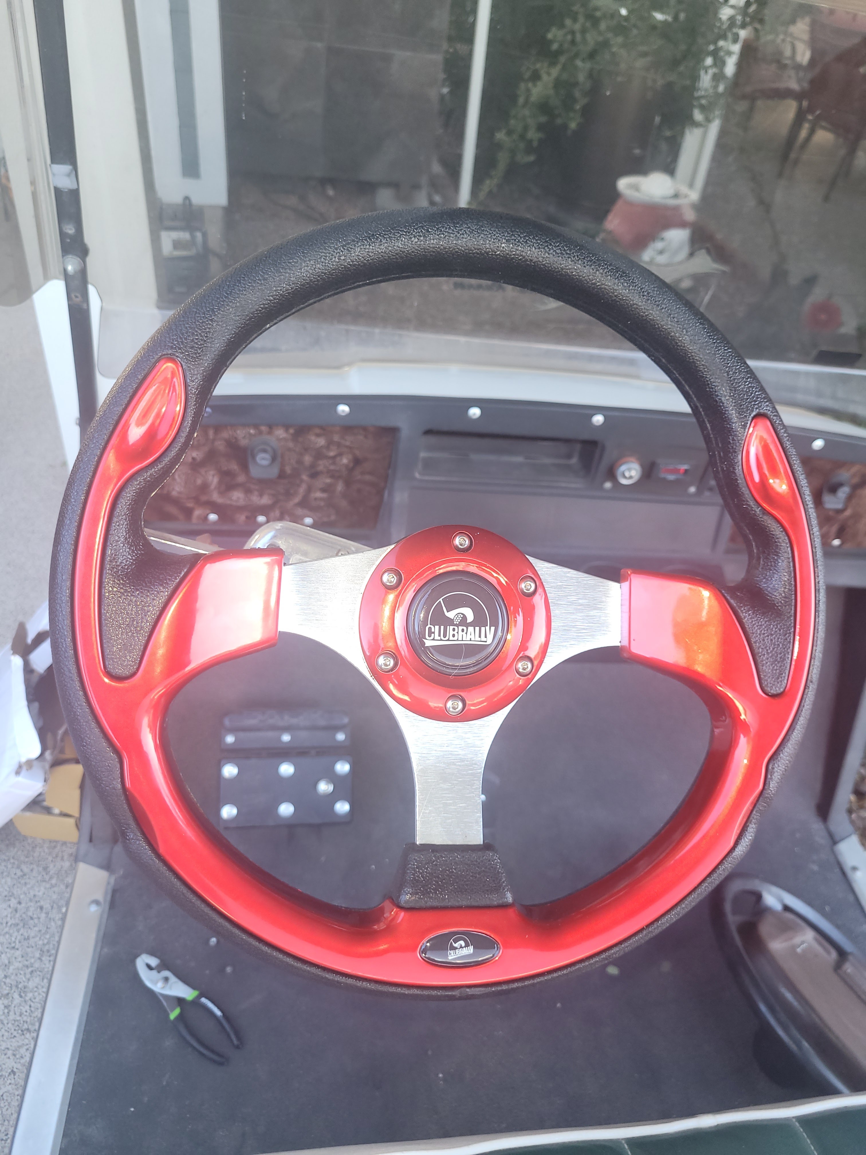 My first part order from Amazon arrived and I did the installation. Trying to find center with a loose steering box isn’t easy and not perfect but I love the new looks. Step ONE was the removal of the Granny curtains ( wind protection canvas) This is Step TWO which is new steering wheel. Step THREE arrives tomorrow which is the new red & black seat covers that I have to install. On Wednesday is Step FOUR of installing a rear flip down seat and bar for clubs. This allows for 4 people and a two second flip down to have a cargo carrier available. Step FIVE is new wheels and rims. Step SIX is to paint the striping on it and Step Seven maybe a lift kit and then it will be done, it will look great and it will come handy. I just need the batteries to last about three years or so.