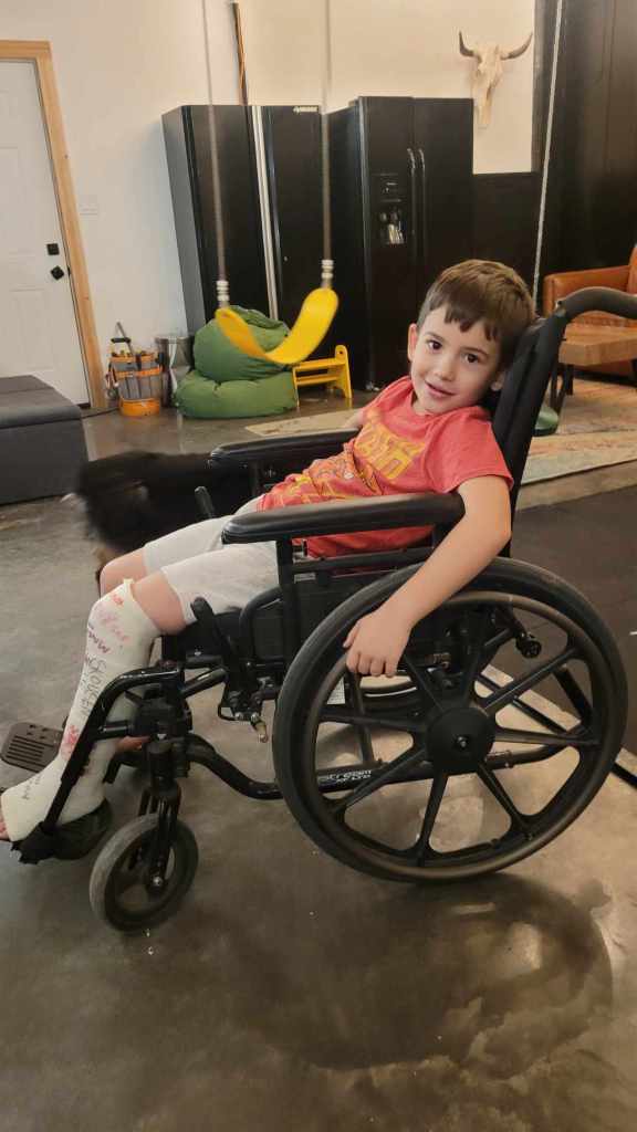 Our poor little Atticus. As a rambunctious boy he jumped off the cabinet and fractured ( for those that don’t know a fracture is a break in the medical world) hit the bean bag for his landing but his leg took the blunt of the force. Logical to think a bean bag landing is safe . LOL I always thought a fracture was like a splinter but doctors like to use fracture to sound more professional than saying broke. It has two cracks in the tibia so full leg cast over the knee, no weight for a month and it should heal just fine. That has to hurt. So lucky not to have surgery with bolts or plates.