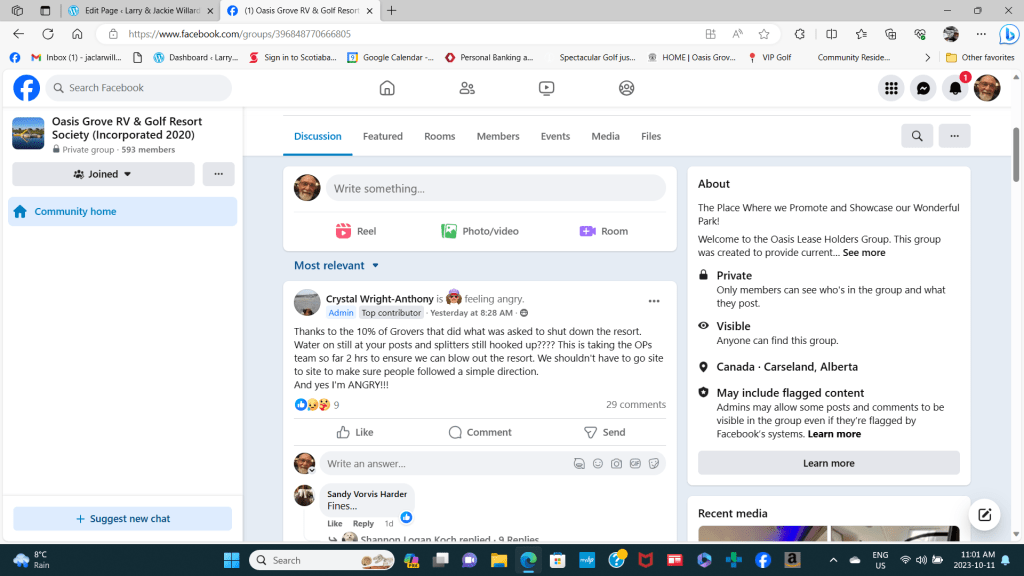 Jeff, Wendy and us headed to Spirit River golf course today. The temperature was nice which was perfect for golf and our enjoyment. The Canada golfing season is ending so you would think we should be at our best but that wasn’t the case for most of us. I did end up with a 84 but it was a battle. Jackie had to pee so didn’t golf the last couple of holes. The golfing was just off for the group. I lost one ball straight down the centre of the fairway due to being covered by I leaf. I assume.