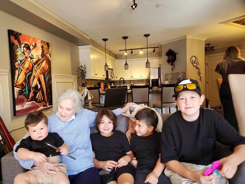 Here is Audrey with 3 children, 5 grand daughters and 4 great grandsons. Funny how that works out.