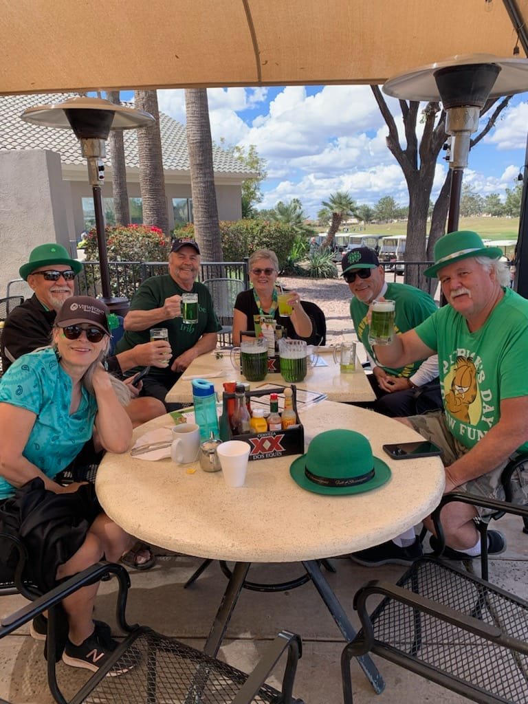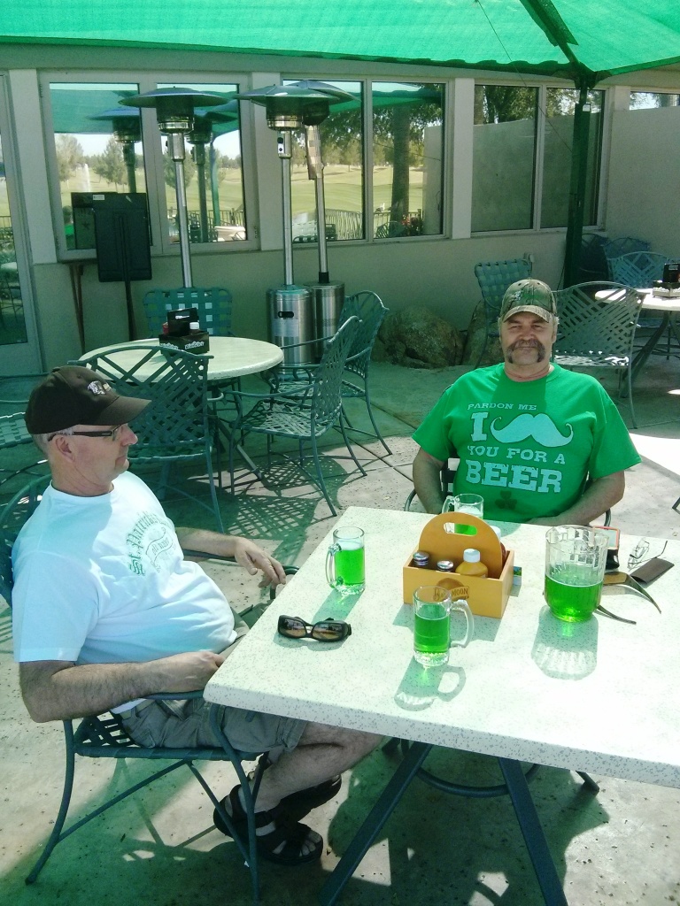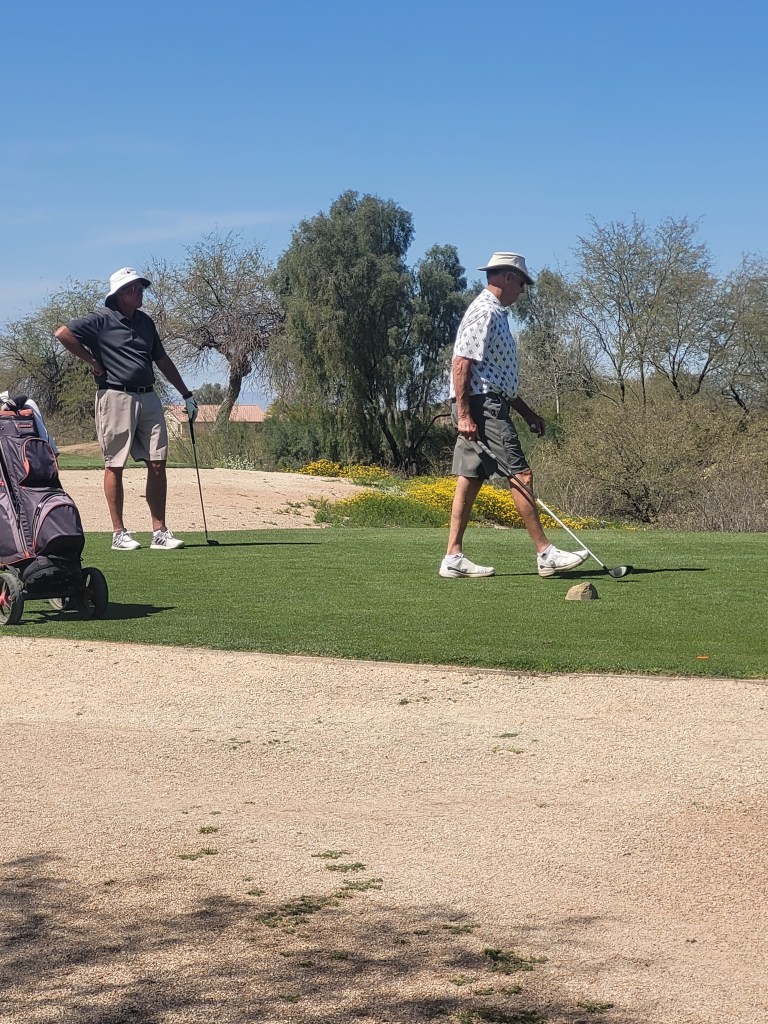 Readied myself for my last golf game in Arizona for this spring. It was one of those days that only can be described as wonderful. No wind, no clouds, nice and warm. Today my group was Mike, and Ron P as we had two groups of threesomes. Everyone for the last game golfed reasonable well with both Mike and I below 40 on the front nine setting ourselves for a below 80 score. On number 18 a long Par 5 with a eagle putt I came up 2ft short. Mike was going for a birdie putt. Ron P cleverly suggested for all three of us to count them and we accepted. Unbeknownst to me with Ron’s handicap he was stroking and it took a buck from my pocket. I had to laugh as he got me good.