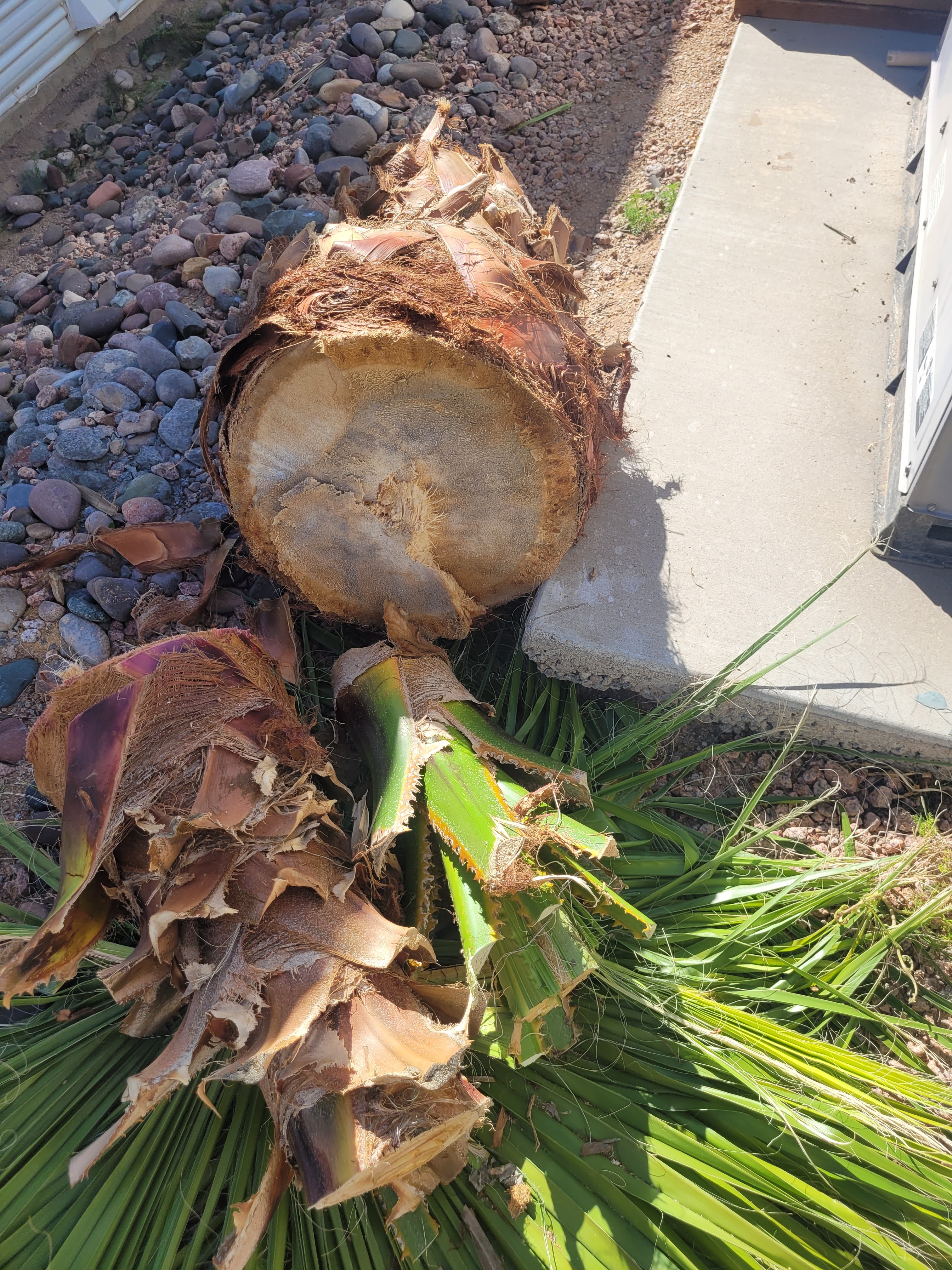 I started first thing this morning before the afternoon heat hit. First on my list was cutting down our Palm tree. I loved the tree but it is more hassle and headache than worth. Chopping it down and having it NOT hit a house was a concern. The wood trunk of a Palm tree is weird and seems to be a very soft wood. The tree trunk was about 18 inches round so no little feat in cutting. I burnt through 2 blades and broke one but finally got it done. I cut it up into manageable but still very heavy sections to haul away. I do have to say it was hot outside getting this done.
