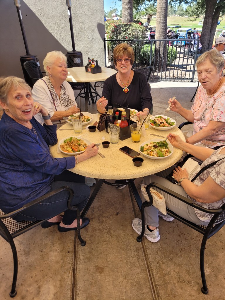 Look at this. This is our neighbor Donna with her friends. 5 ladies all having SALAD, water or juice for lunch right beside us having Chicken Wings, Onion Rings and Beer. Women live longer than men no arguing that, but the why hasn’t been answered. Environmental issues, stress issues, hormonal issues, workplace death etc all have thought to be the difference but maybe this picture is trying to tell us something. I will say to live 5 years more and not FULLY enjoy it , is it worth it ?