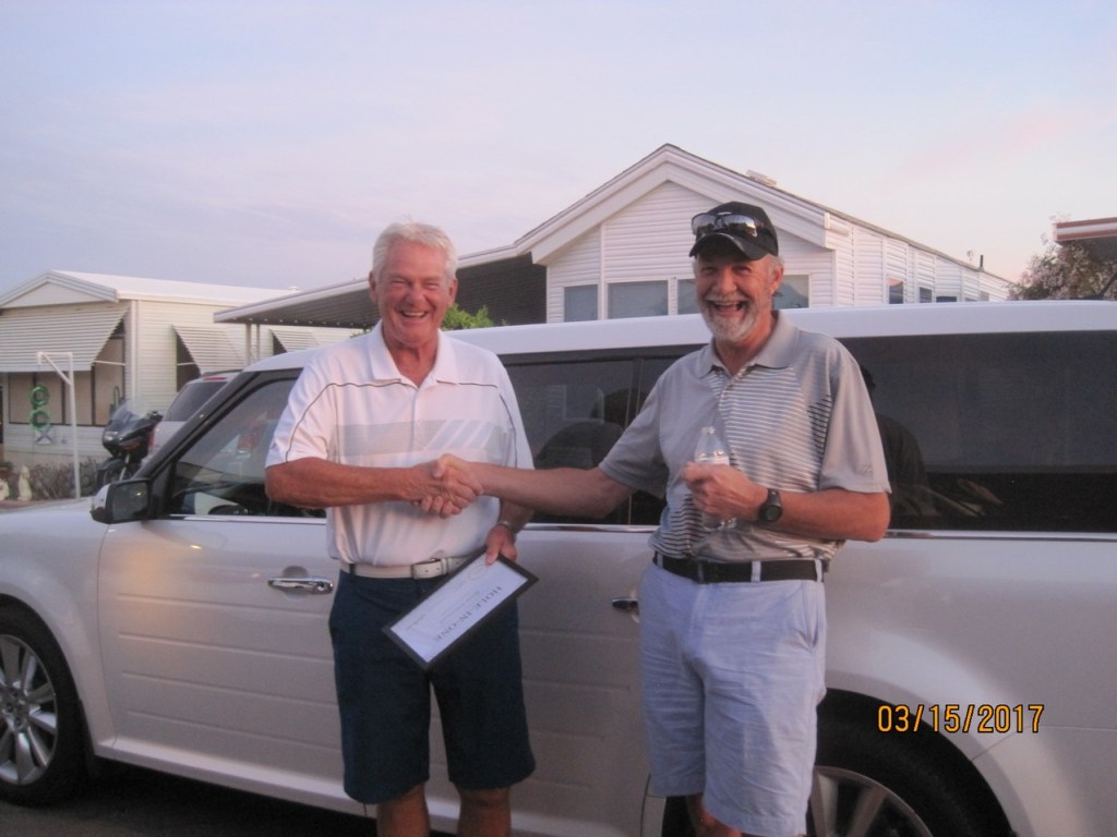 This picture is one of our fun times. I ride with Sandy each week to our games. He always complained about not getting his Hole in One certificate when he registered it online. I had enough of the whining. LOL. I created one and presented it to him before heading to the Whirlwind Golf Club. Ps notice the awesome car Sandy used to drive. That is why I bought a Flex for Jackie.