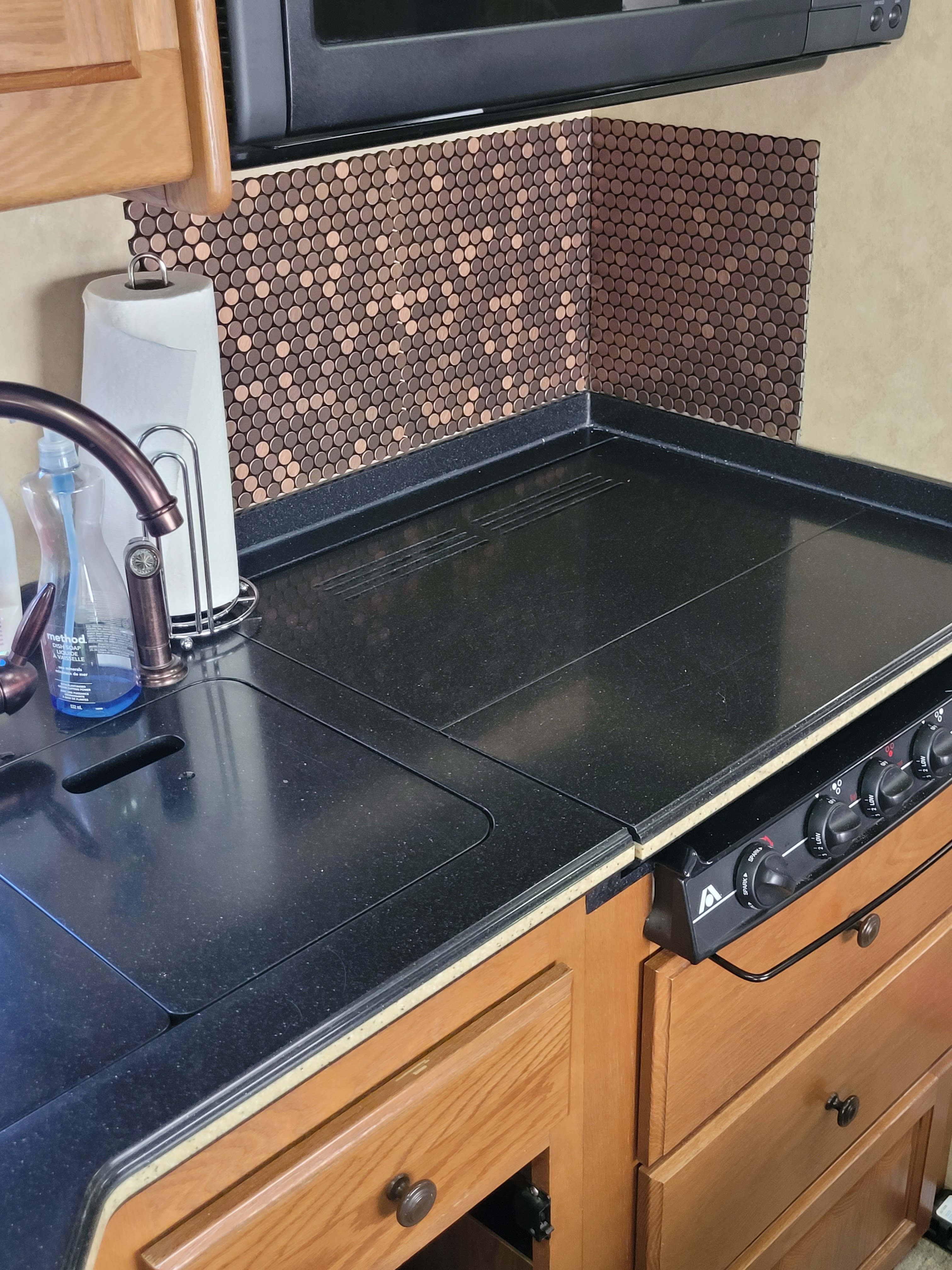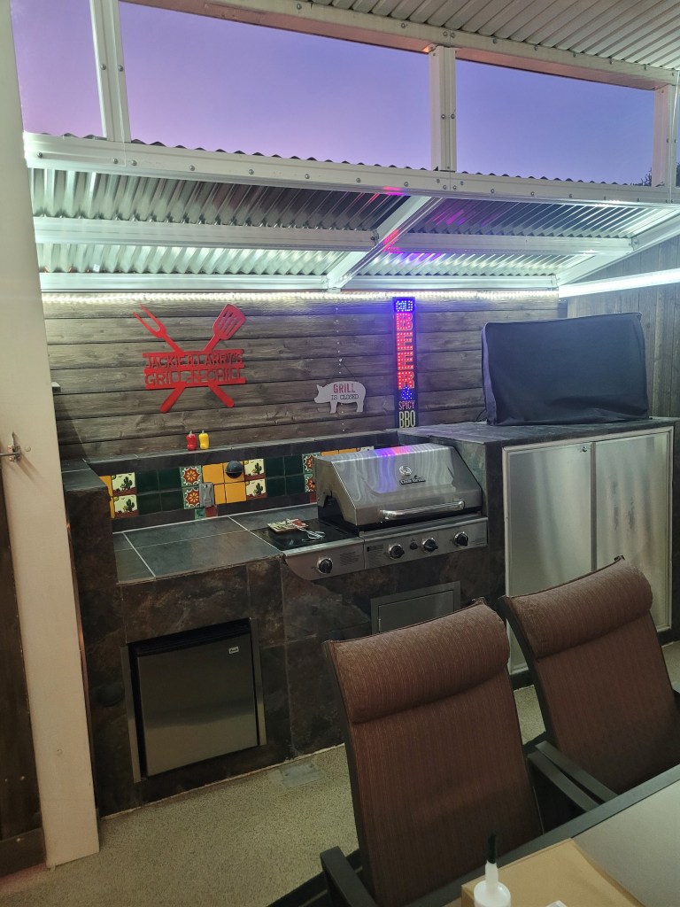 Finished off my outdoor kitchen and I love the functionality of it. Plan C after two wind fail editions. This one is strong and i like the looks of it. Just added a 49 inch TV in December to replace this 32 inch.
