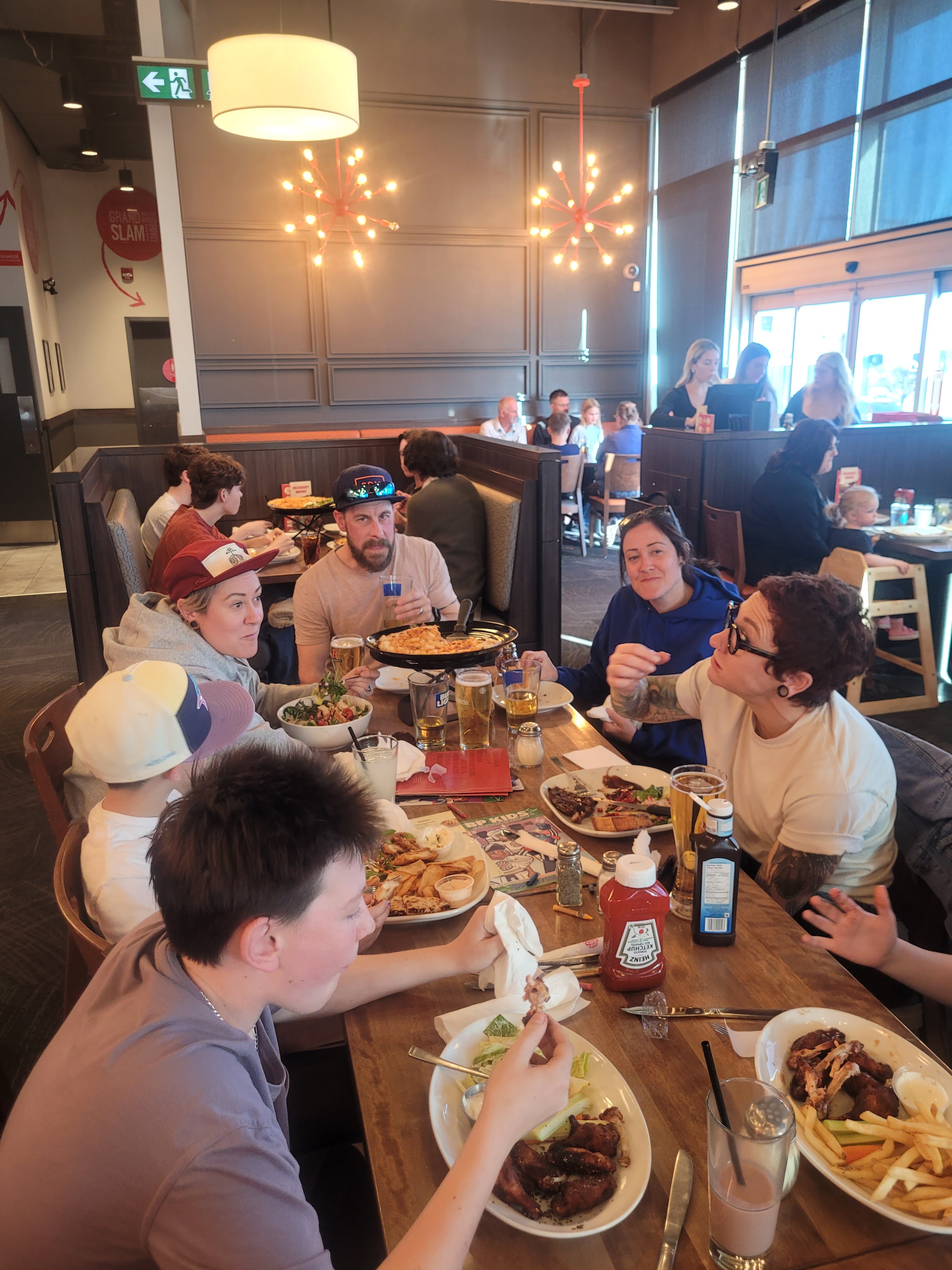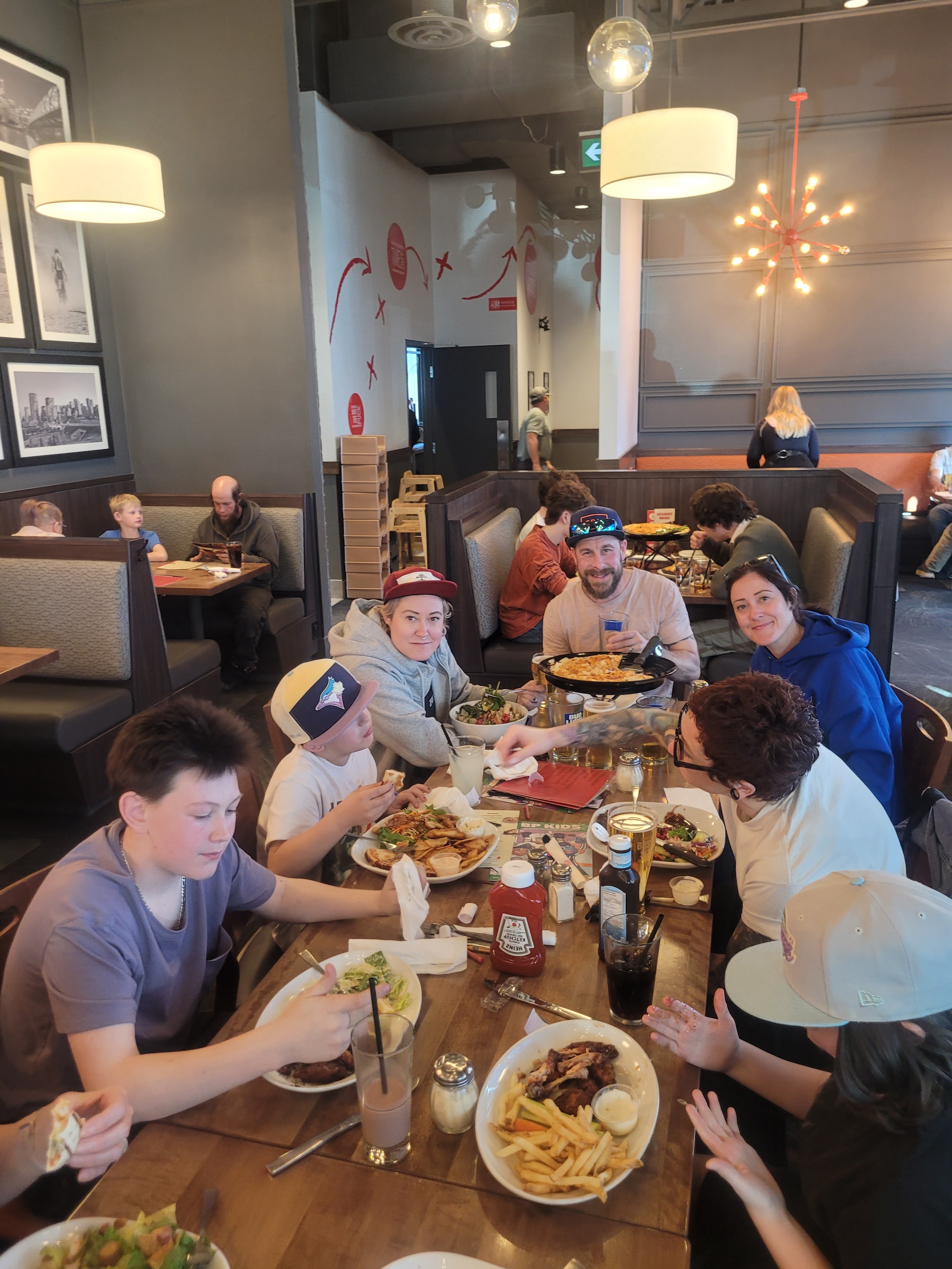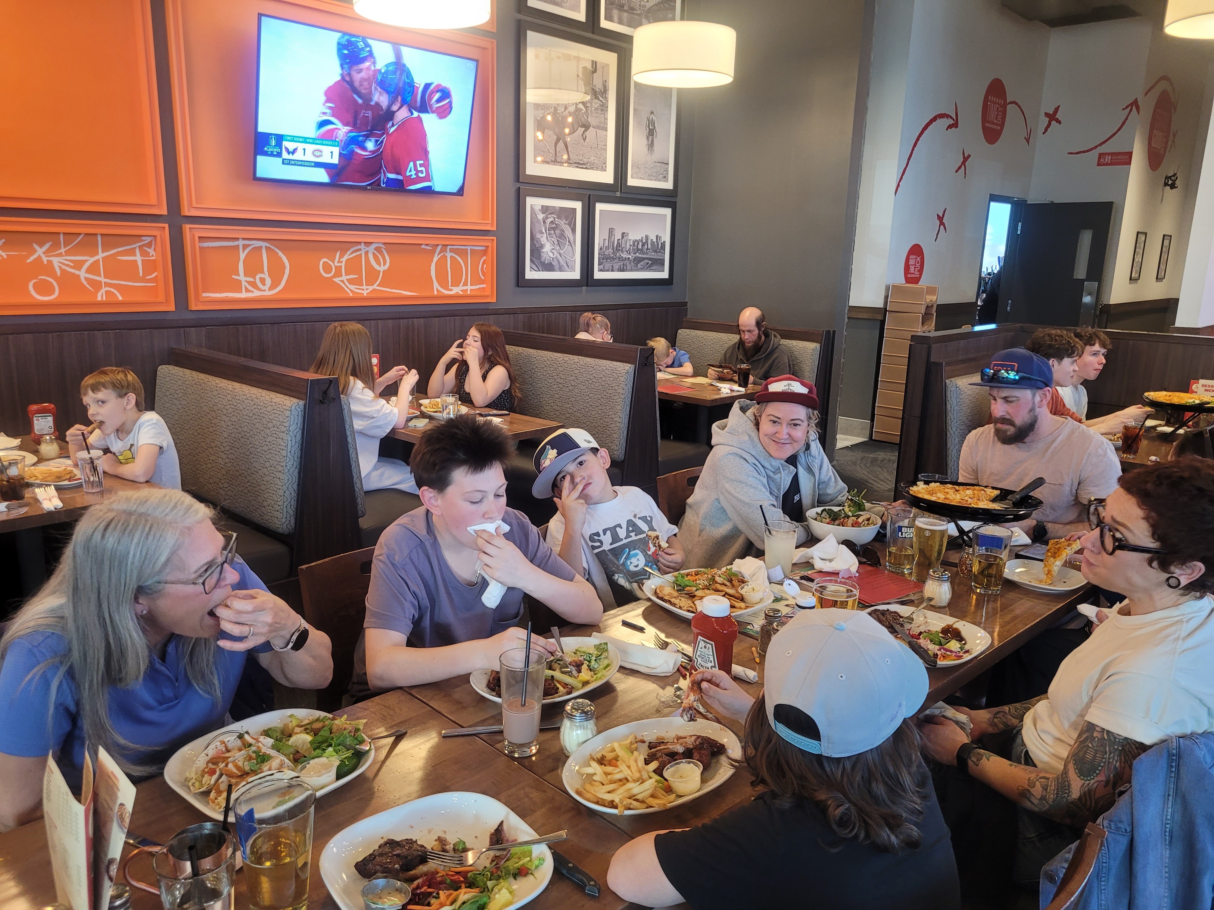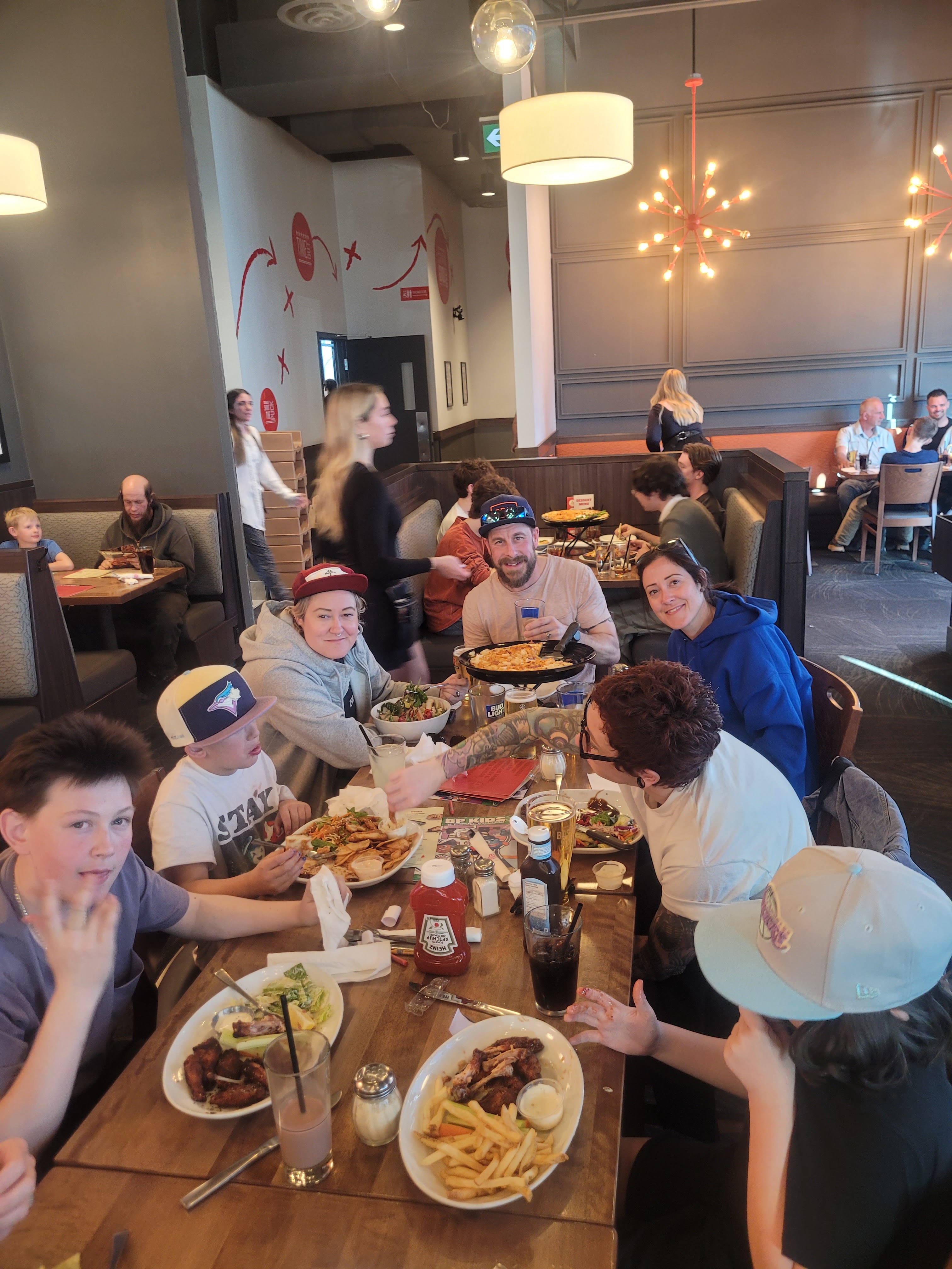 After golf we whipped home and changed and drove over to Boston Pizza. As you know as a family from the time the girls were 8 to about 22 we had Boston Pizza every Friday night. It became like a tradition. We all still like Boston. Tonight we had our whole family together. Victoria, Corey, Penny ,Jessica, Jackson, August, Atticus , Jackie and I.