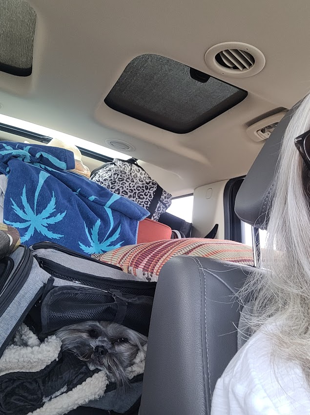 At this one station, this guy stops for gas in an old Benz. A pallet is strapped to his roof and trunk through the rear windows. A set of golf clubs and briefcases, etc., are tied on top of it. I have never seen anything like this in my life. Wouldn’t you know it as Jackie was walking Daisy he pulls up to her and is asking for cash. Fool us once but not twice ! LOL