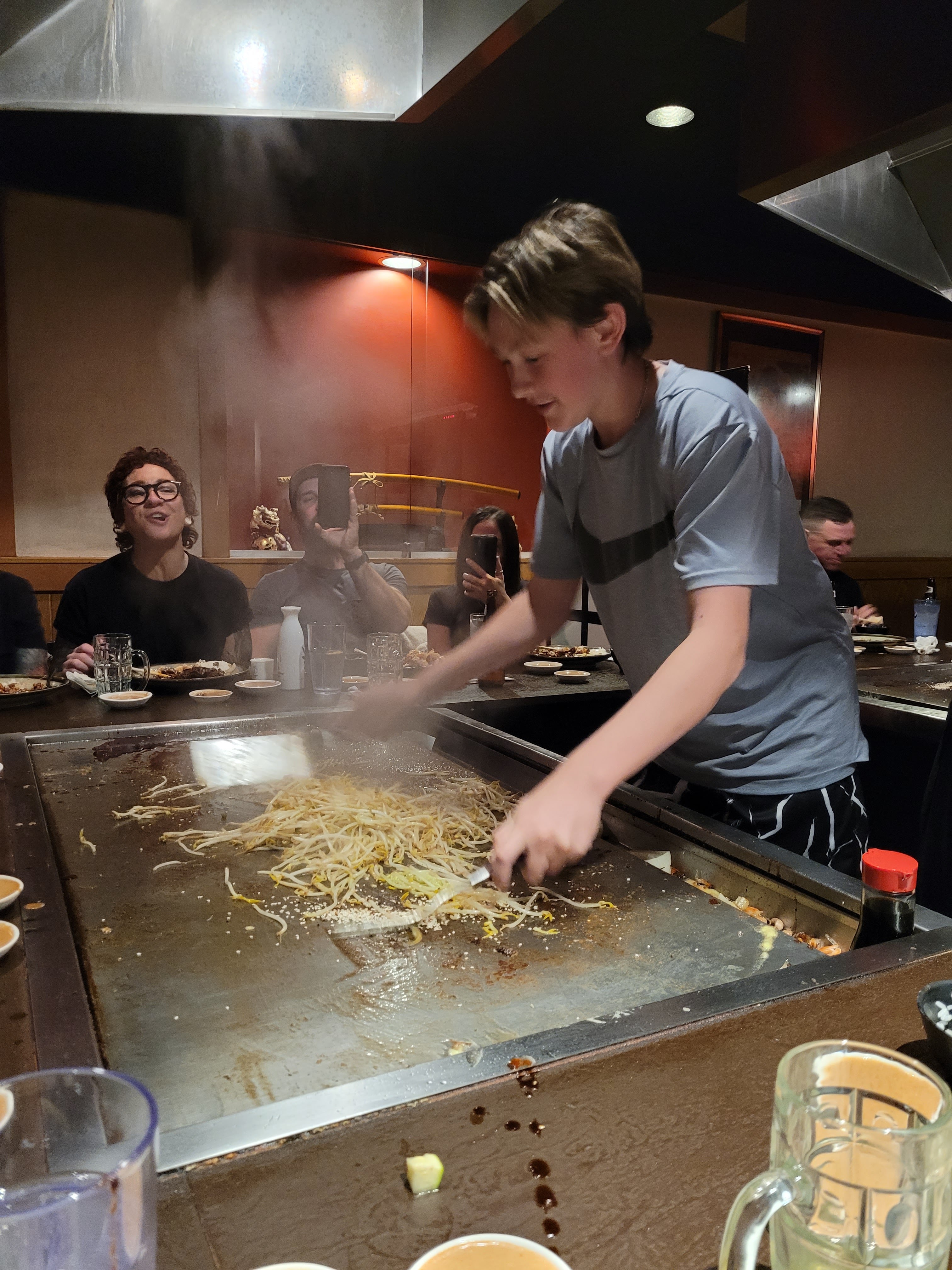 Jackson’s choice was the Japanese Village for his birthday family gathering. Excellent choice as we all had a wonderful time combining great food and entertainment. Our chef tonight brilliant and very funny. No knives thrown that hit anybody. I was surprised Victoria was so calm seeing shrimp and noodles being cooked right in front of her on the grill. I don’t know why she wouldn’t want those huge puffed up lips !
